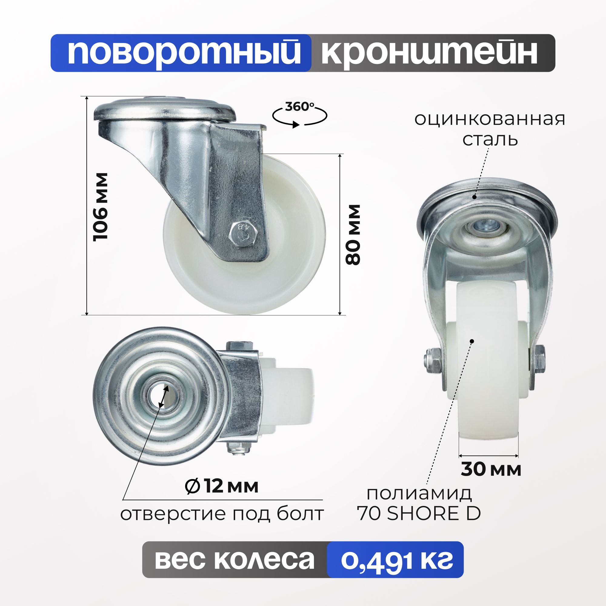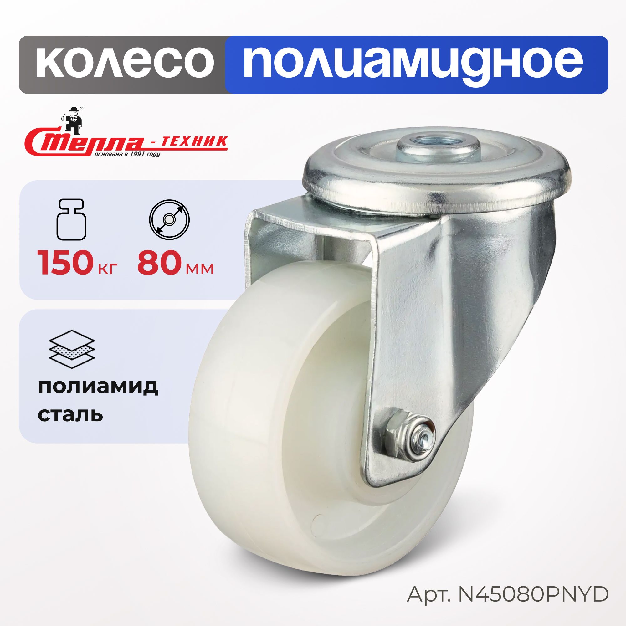 Колесо нейлоновое (80 мм, 150 кг) поворотное Стелла-техник N45080PNYD