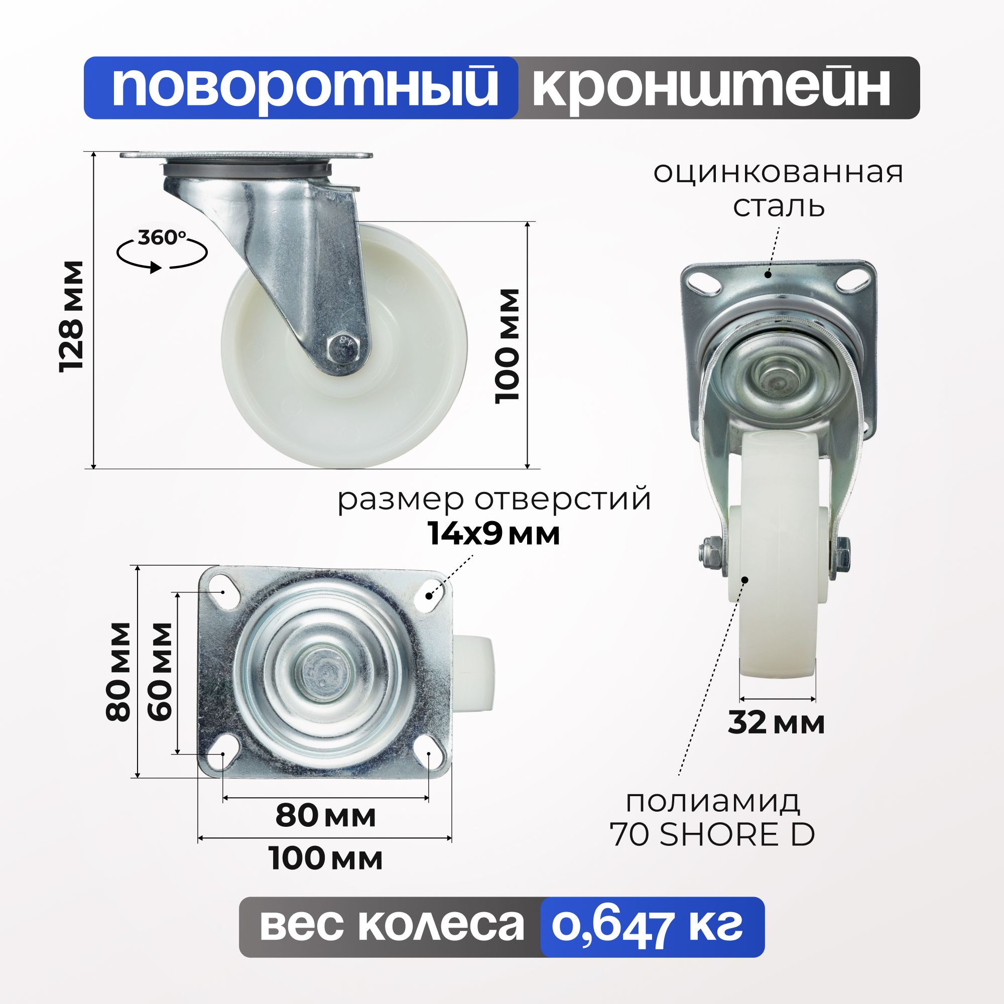 Колесо нейлоновое (100 мм, 200 кг) поворотное Стелла-техник N48100PNY