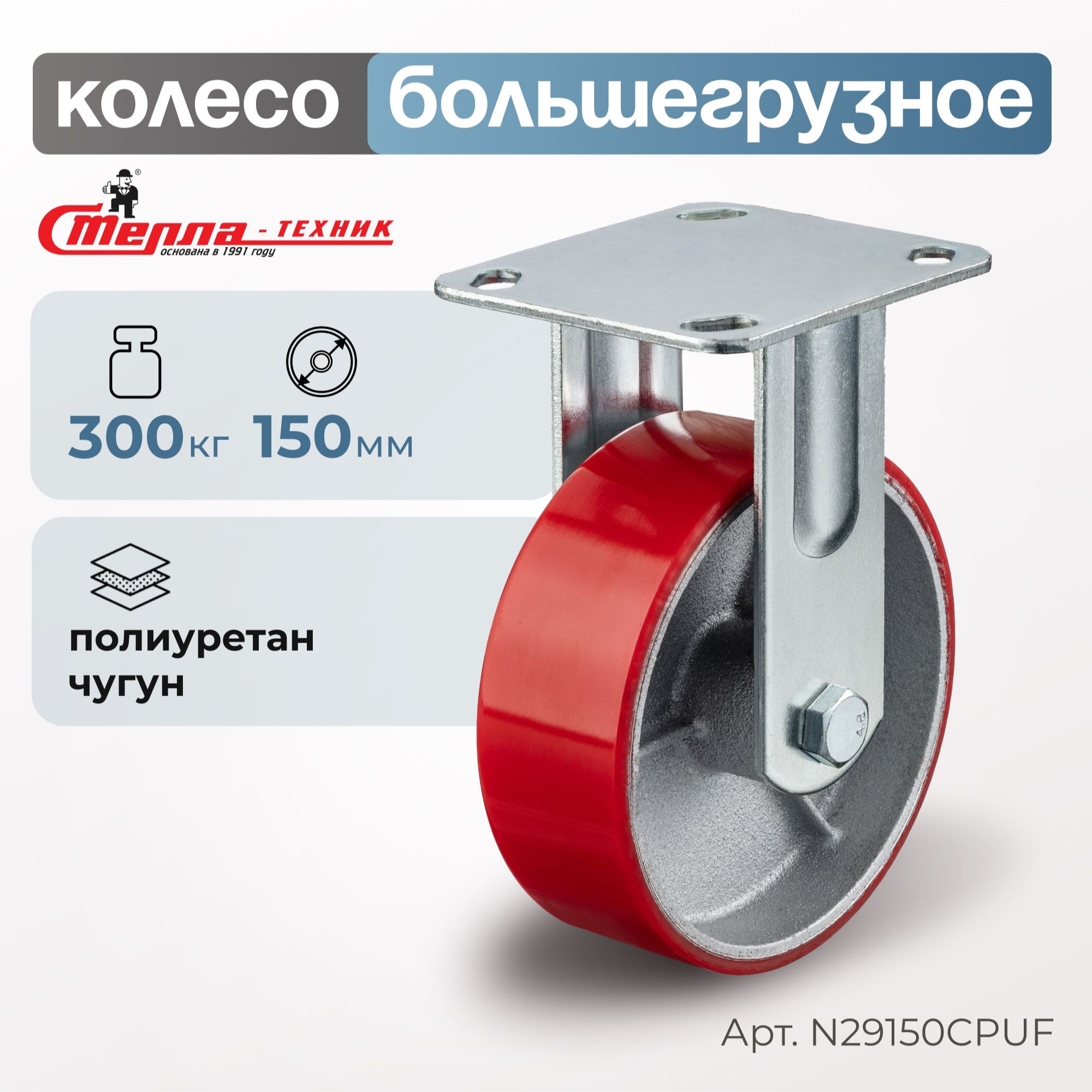 Колесо промышленное (150 мм, 300 кг) неповоротное Стелла-техник, полиуретан / чугун N29150CPUF