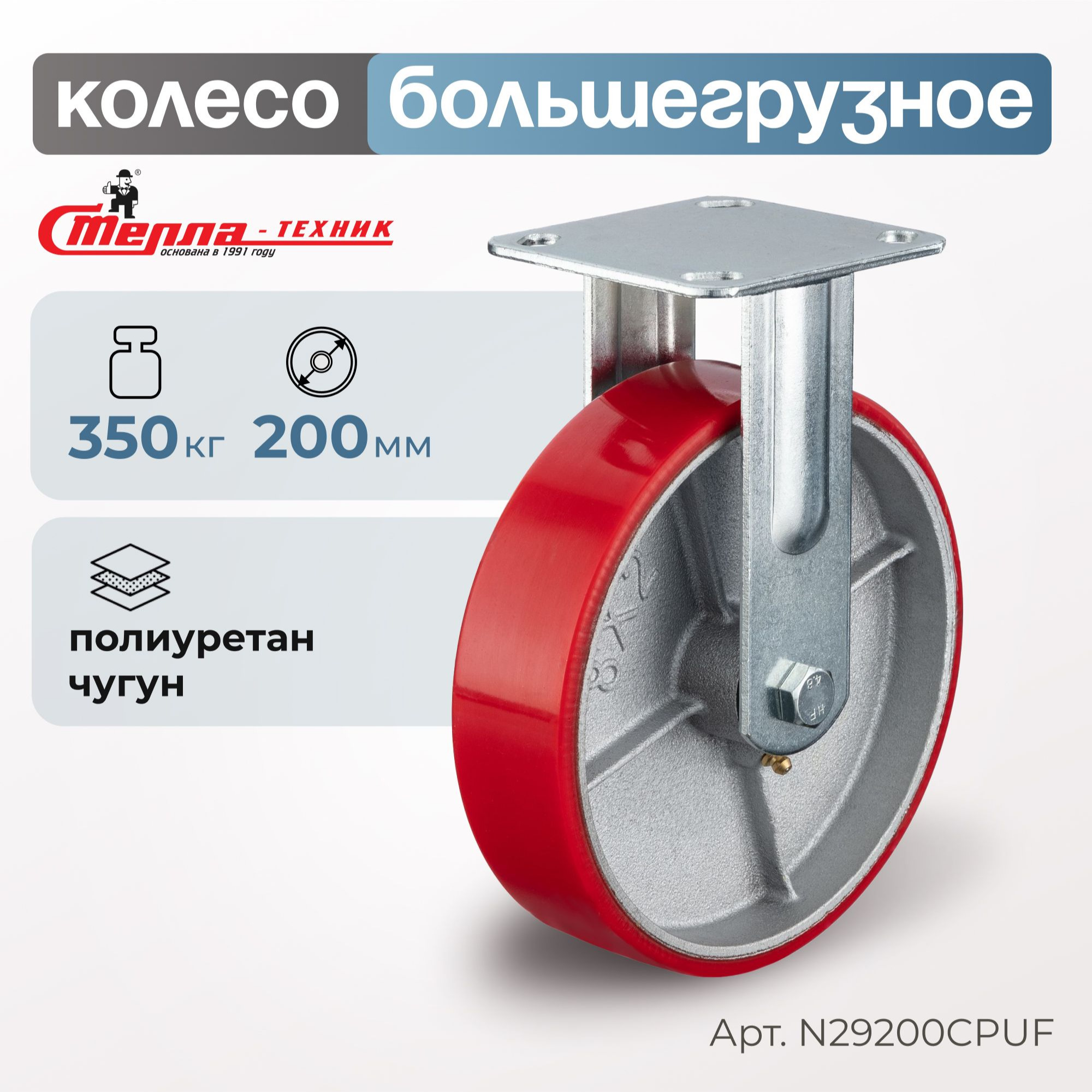 Колесо промышленное (200 мм, 350 кг) неповоротное Стелла-техник, полиуретан / чугун N29200CPUF