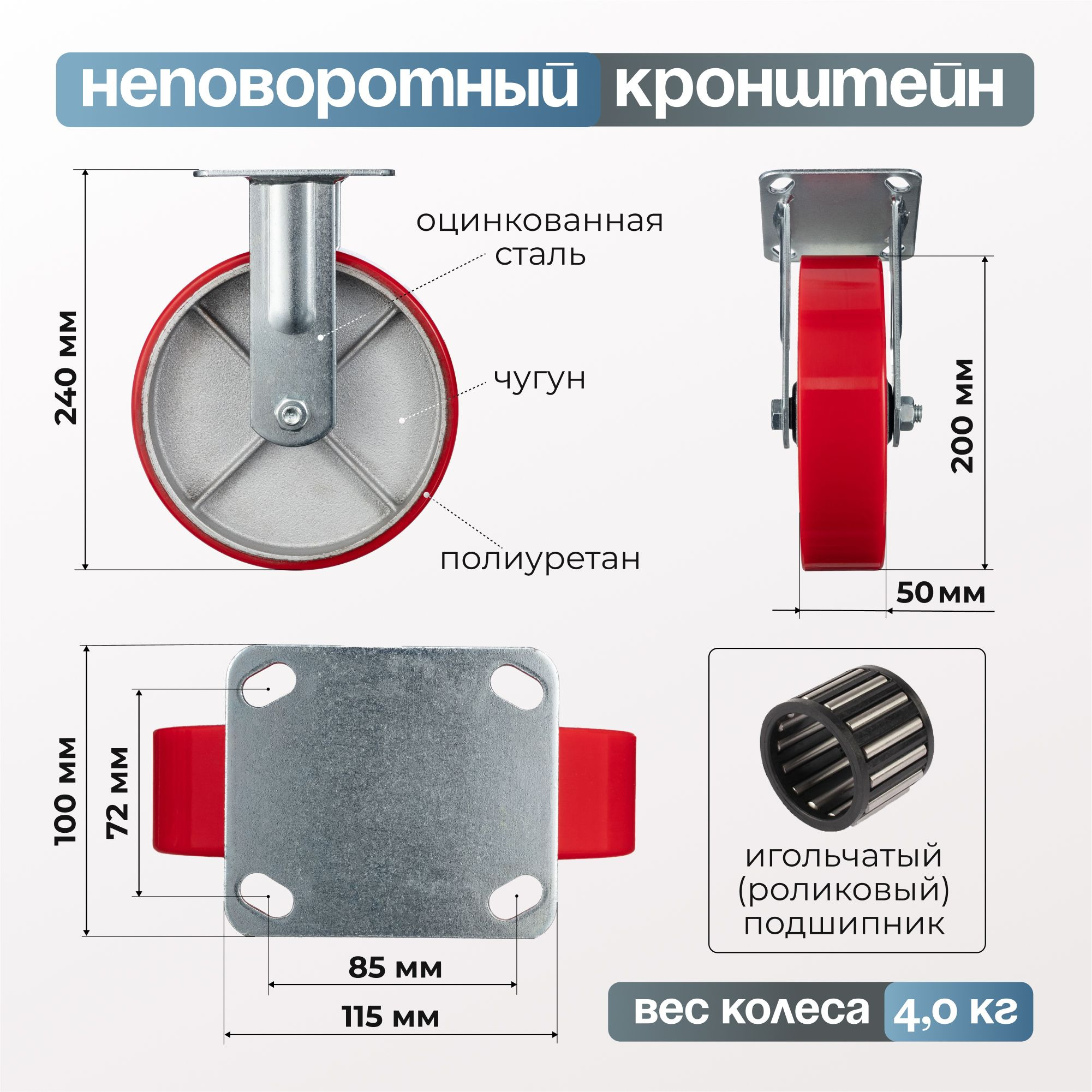 Колесо большегрузное полиуретановое (200 мм; 750 кг) неповоротное, полиуретан / алюминий 658606