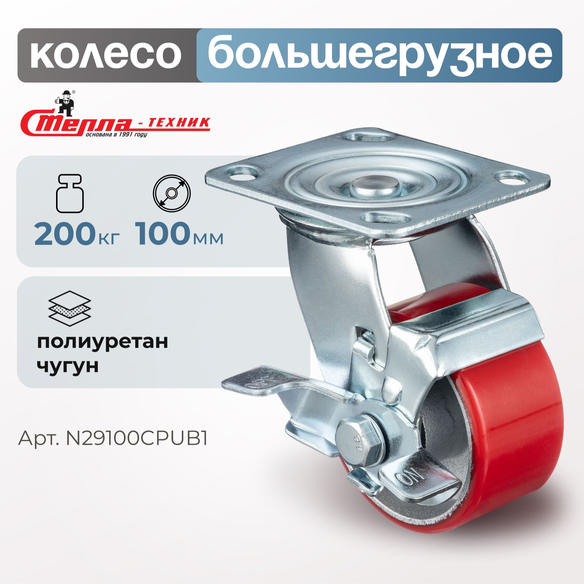 Колесо промышленное (100 мм, 200 кг) поворотное с тормозом Стелла-техник, полиуретан / чугун N29100CPUB1