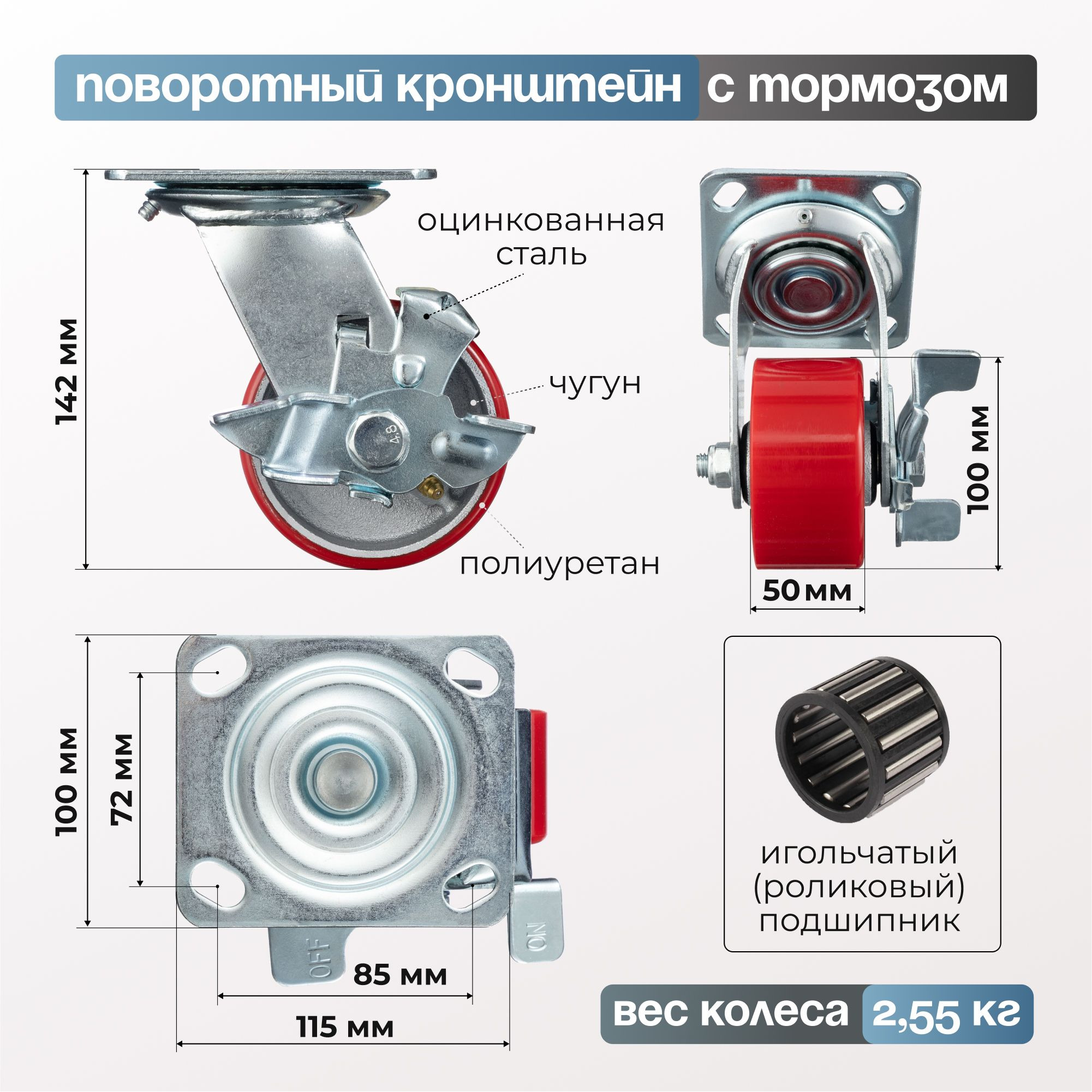 Колесо большегрузное (125 мм; 550 кг) поворотное с тормозом Tellure Rota, полиуретан, чугун, шариковый подшипник, кронштейн EP 644863