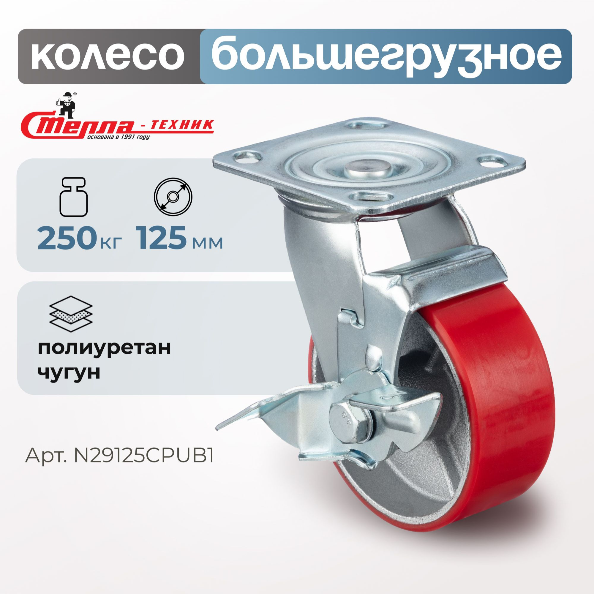 Колесо промышленное (125 мм, 250 кг) поворотное с тормозом Стелла-техник, полиуретан / чугун N29125CPUB1