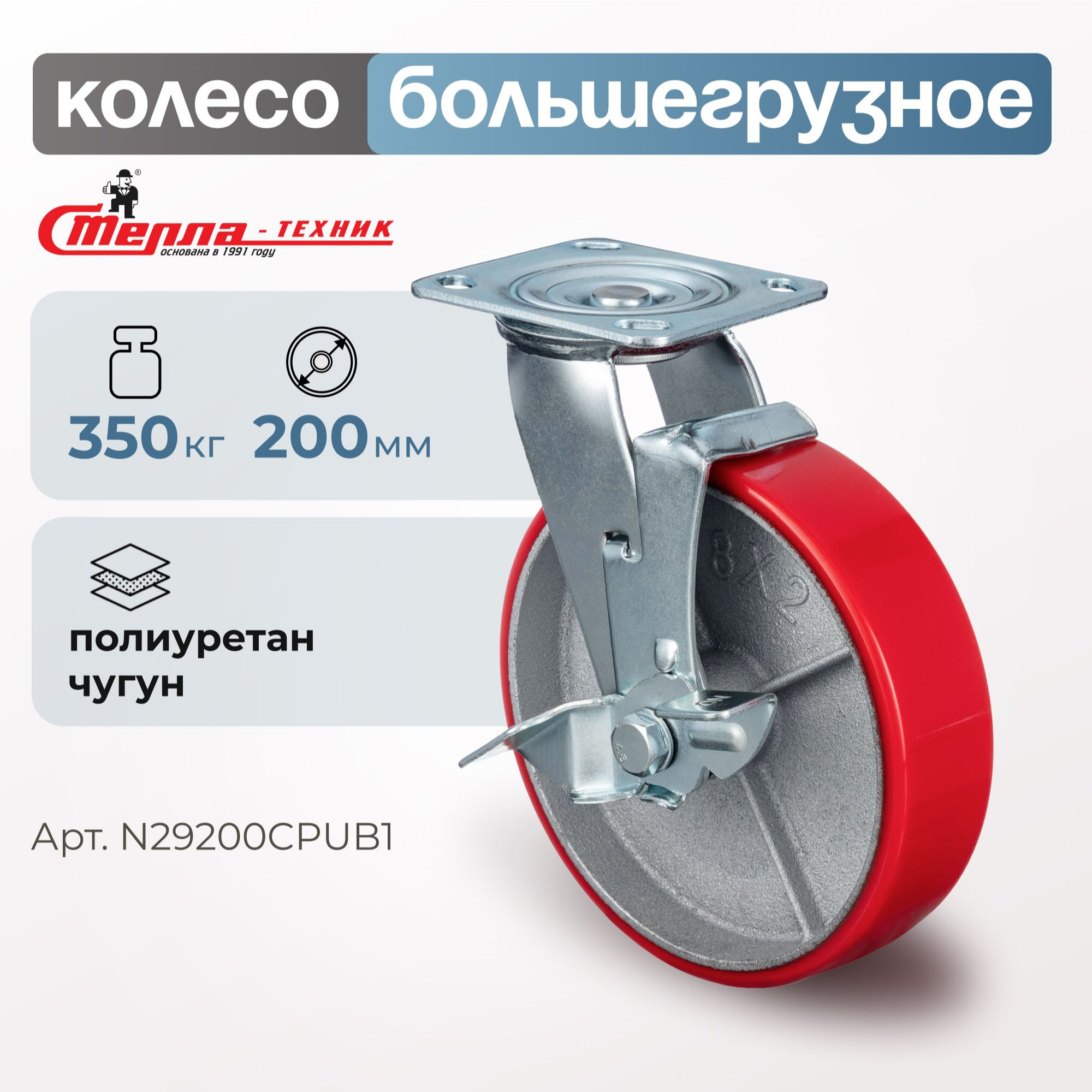 Колесо промышленное (200 мм, 350 кг) поворотное с тормозом Стелла-техник, полиуретан / чугун N29200CPUB1