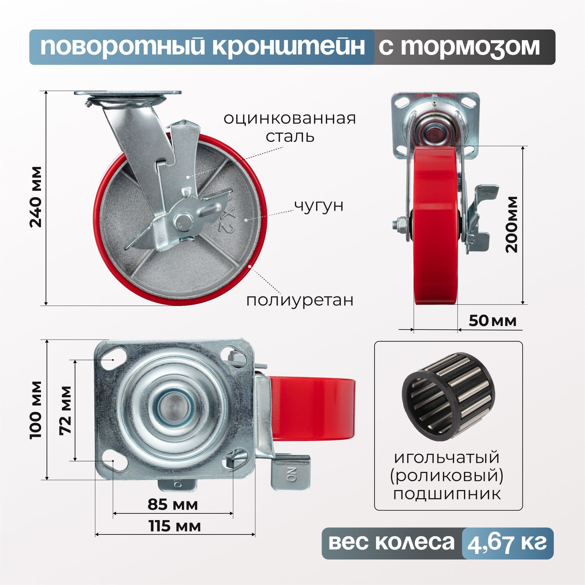 Колесо большегрузное (200 мм; 1600 кг) поворотное с тормозом Tellure Rota, полиуретан, чугун, шариковый подшипник 648516