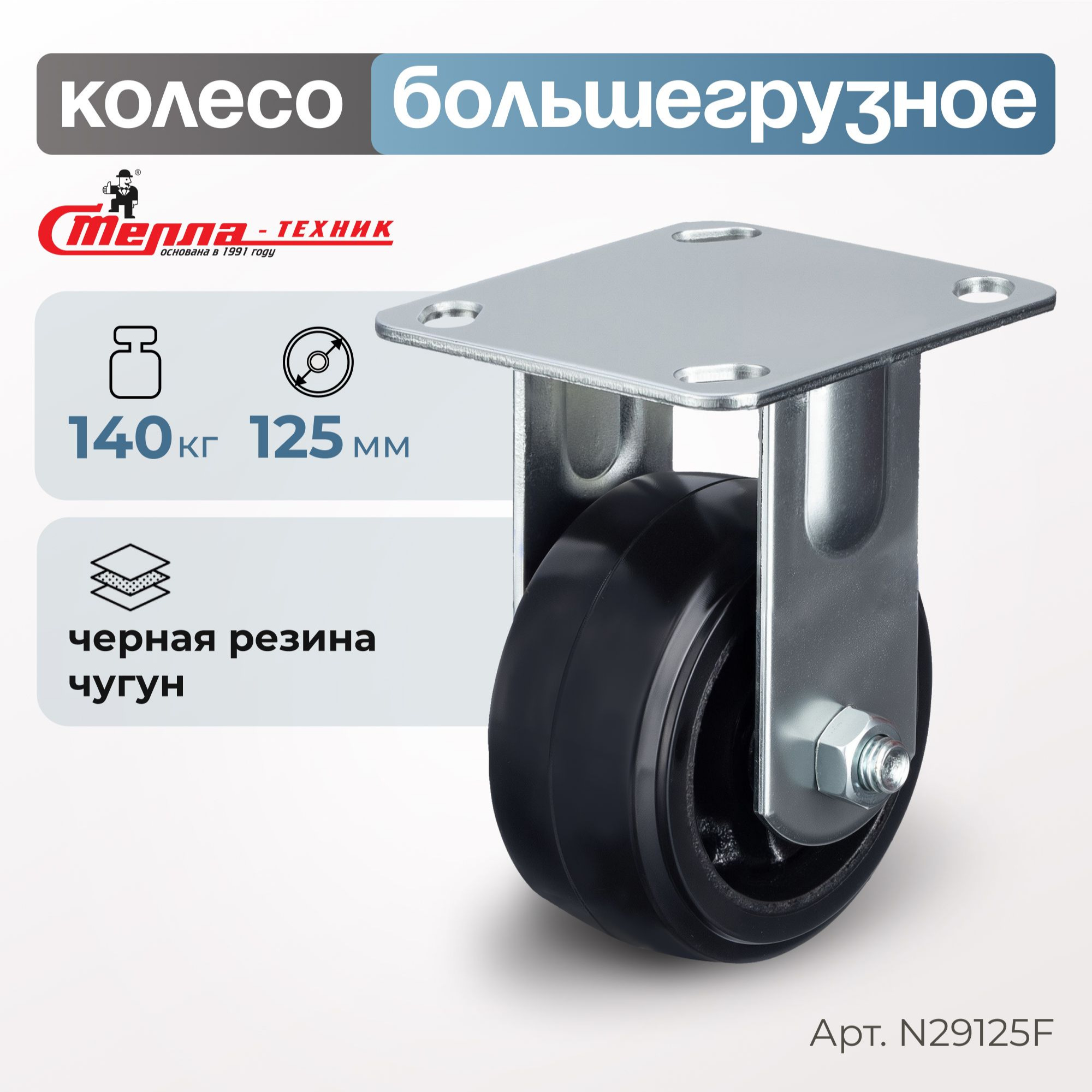 Колесо большегрузное обрезиненное (125 мм, 140 кг) неповоротное Стелла-техник, черная резина / чугун N29125F