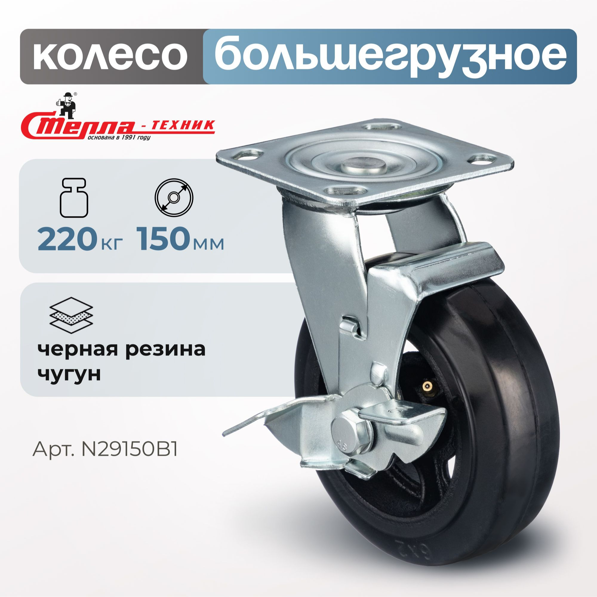 Колесо большегрузное обрезиненное (150 мм, 220 кг) поворотное с тормозом Стелла-техник, черная резина / чугун N29150B1