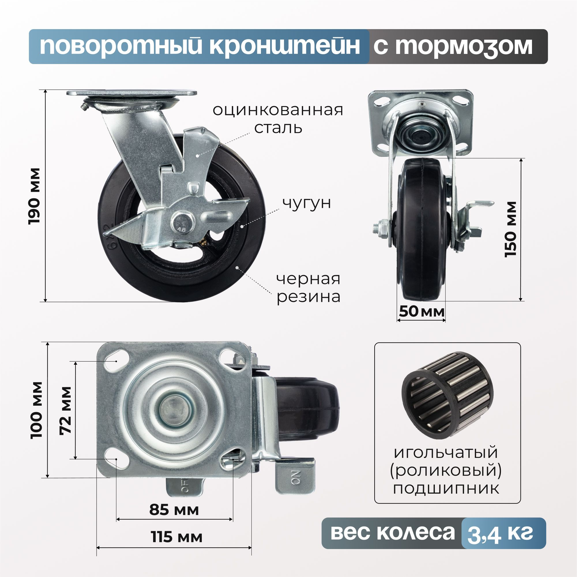 Колесо (160 мм, 300 кг) большегрузное поворотное с тормозом Стелла-техник 7203-160