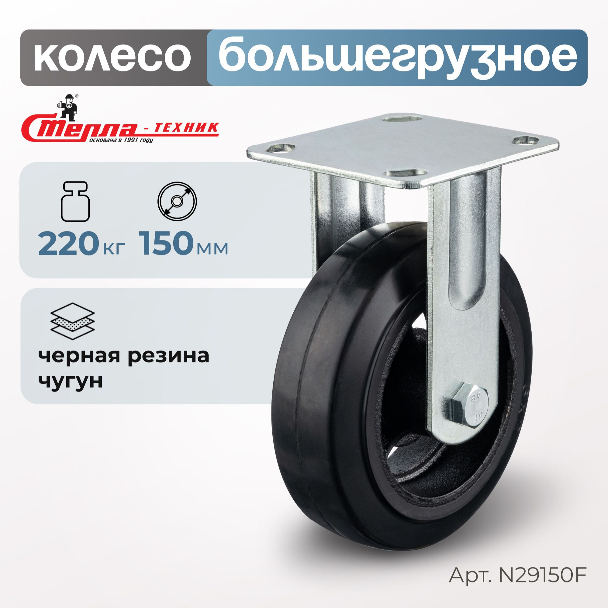 Колесо большегрузное обрезиненное (150 мм, 220 кг) неповоротное Стелла-техник, черная резина / чугун N29150F