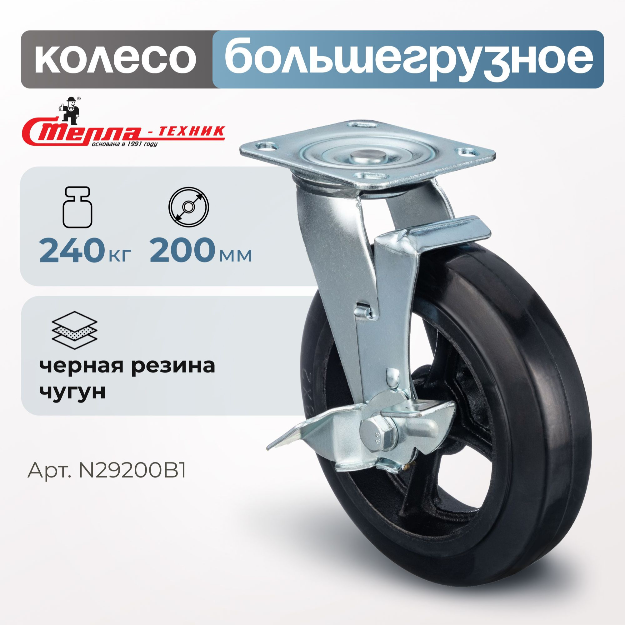Колесо большегрузное обрезиненное (200 мм, 240 кг) поворотное с тормозом Стелла-техник, черная резина / чугун N29200B1