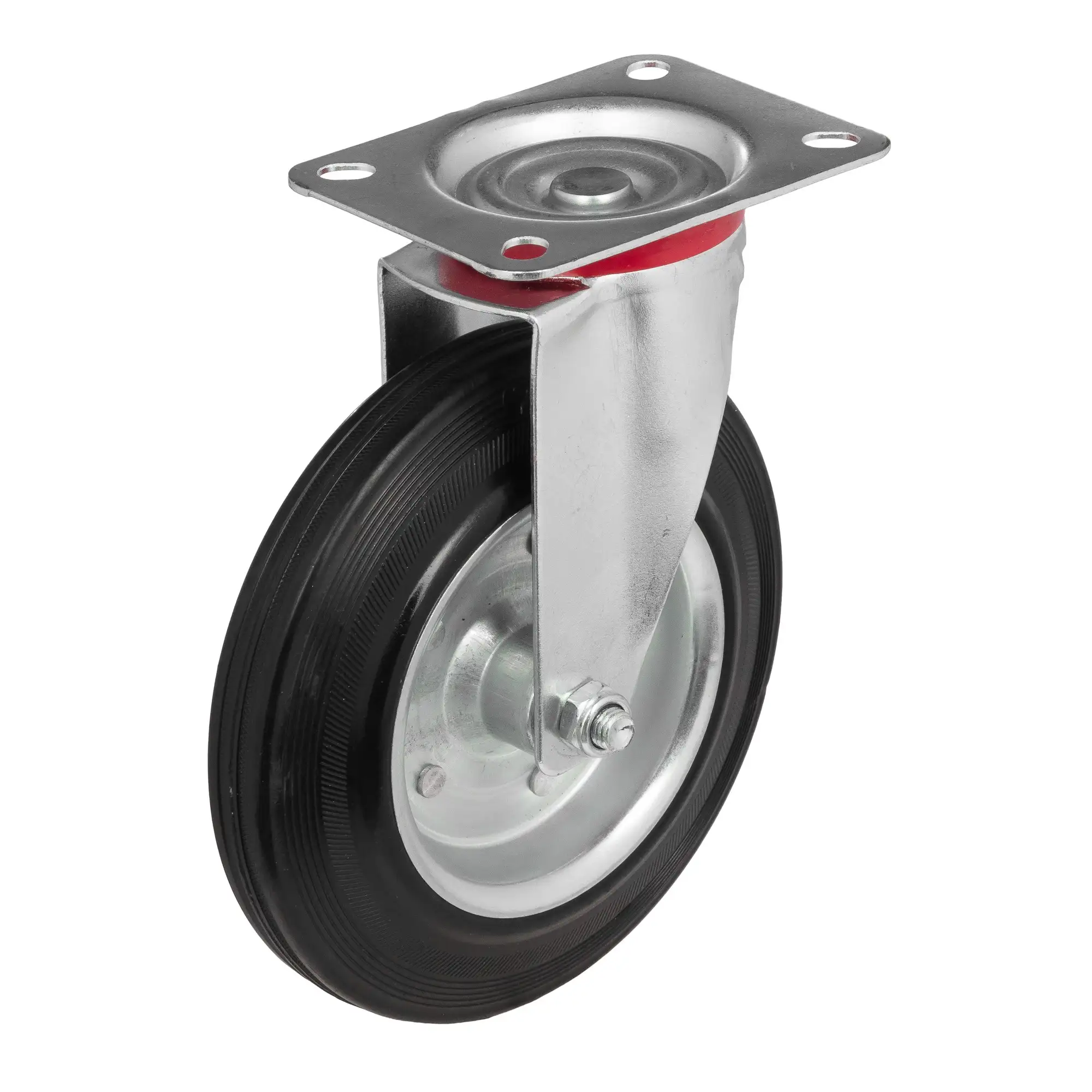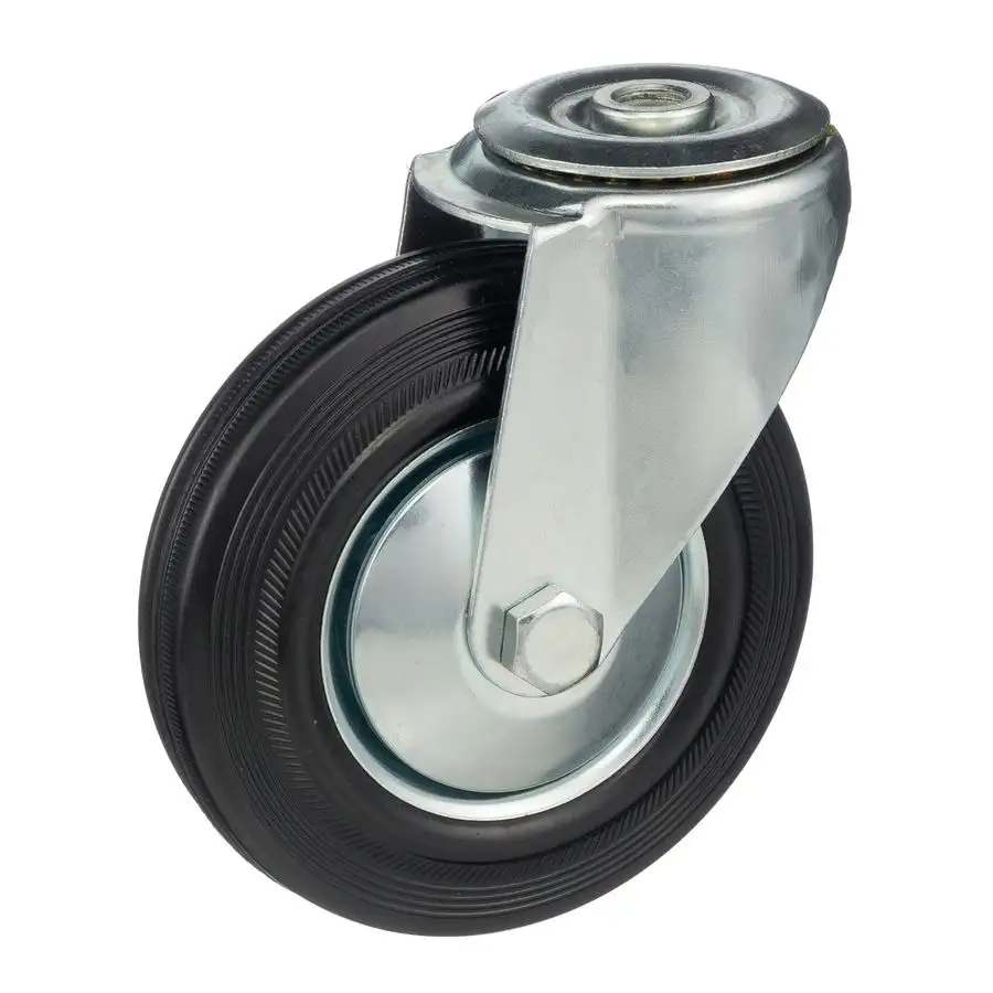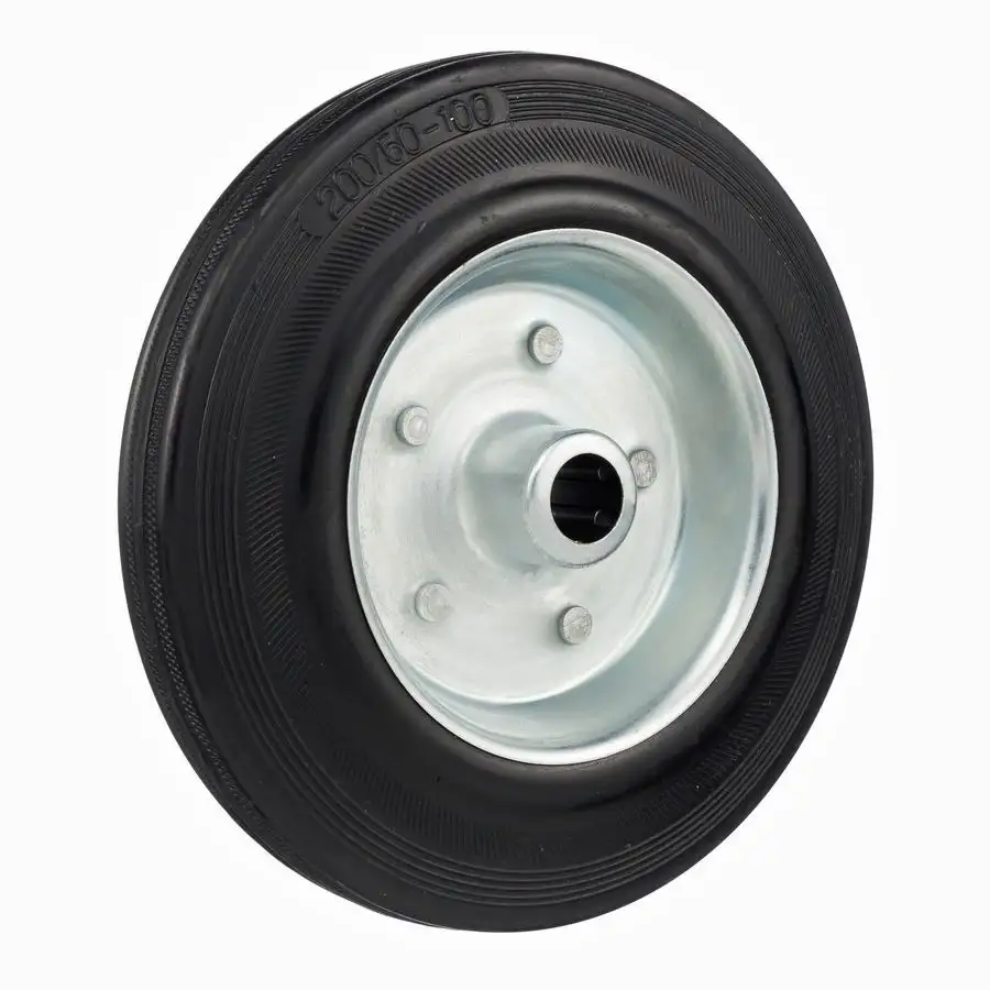 Промышленные колеса с ободом из черной литой резины и центром из двух гальванизированных дисков из штампованной стали.