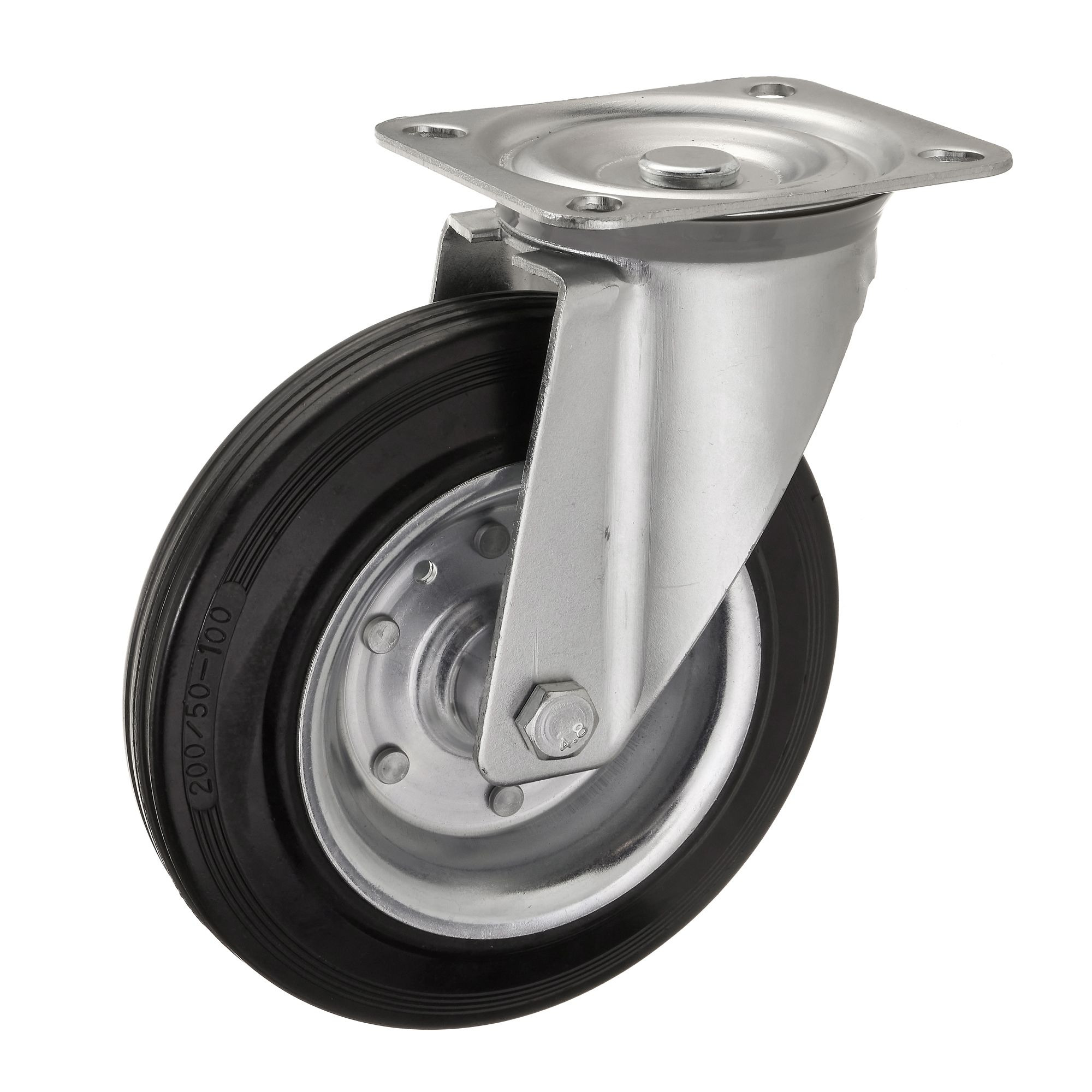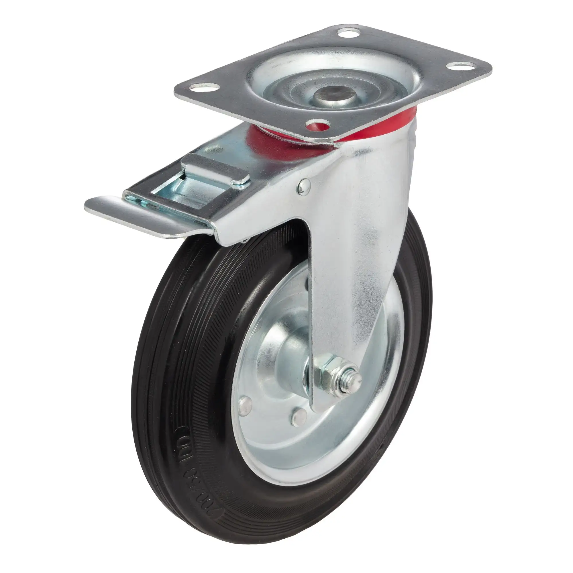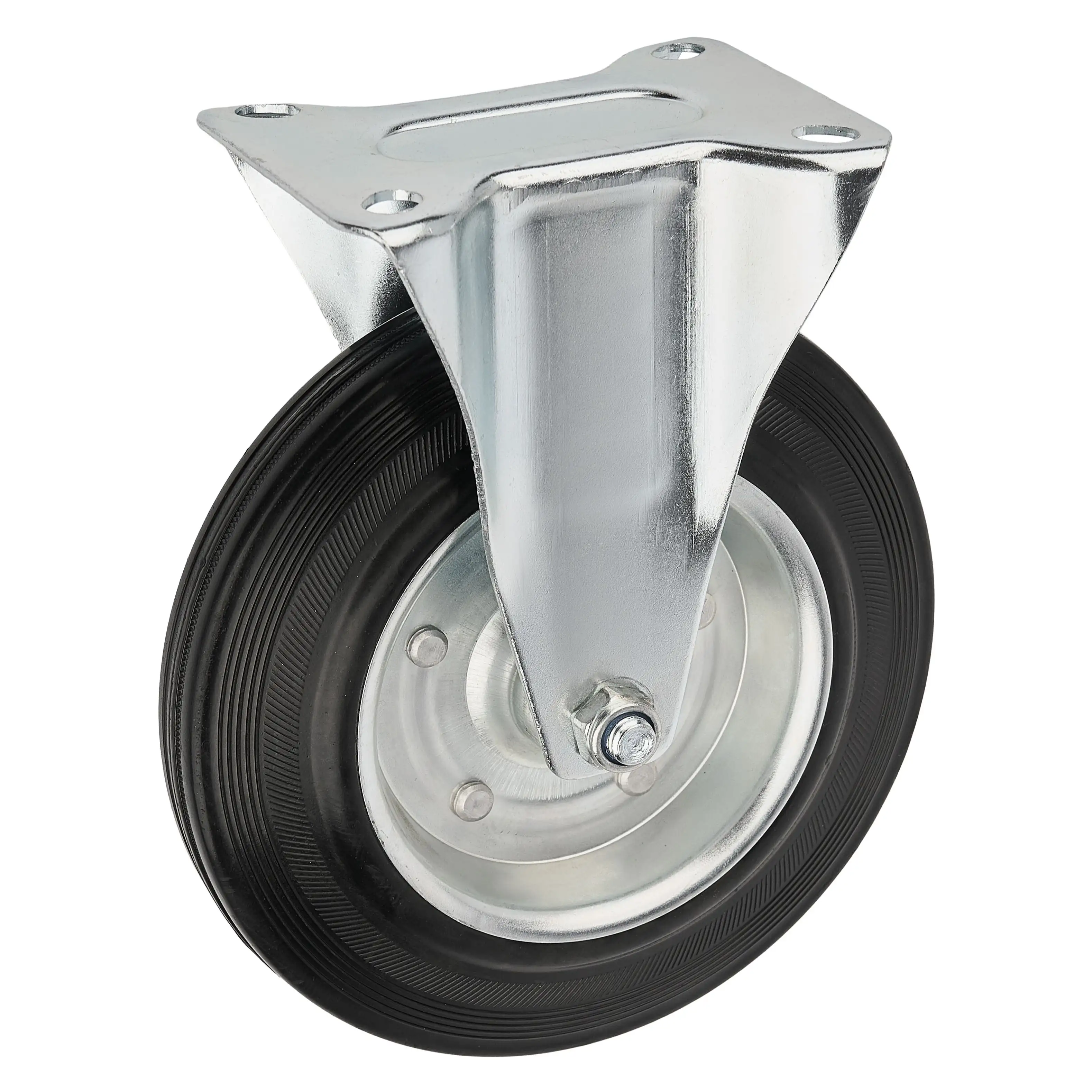Промышленные колеса с ободом из черной литой резины и центром из двух гальванизированных дисков из штампованной стали.