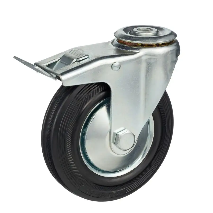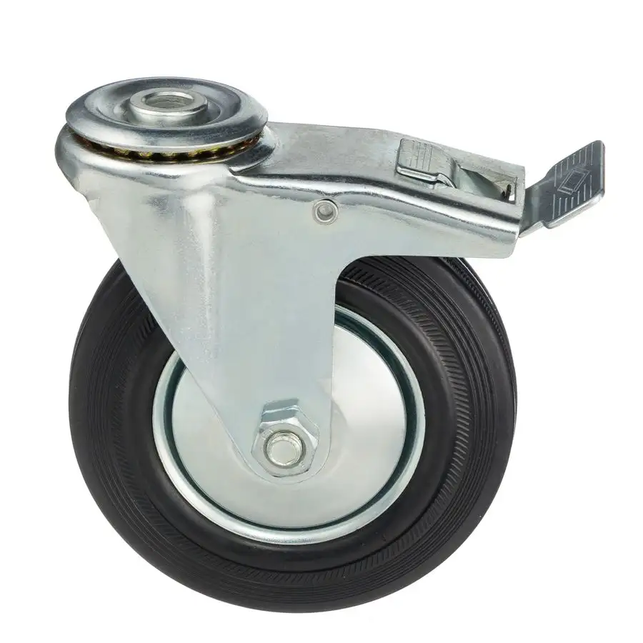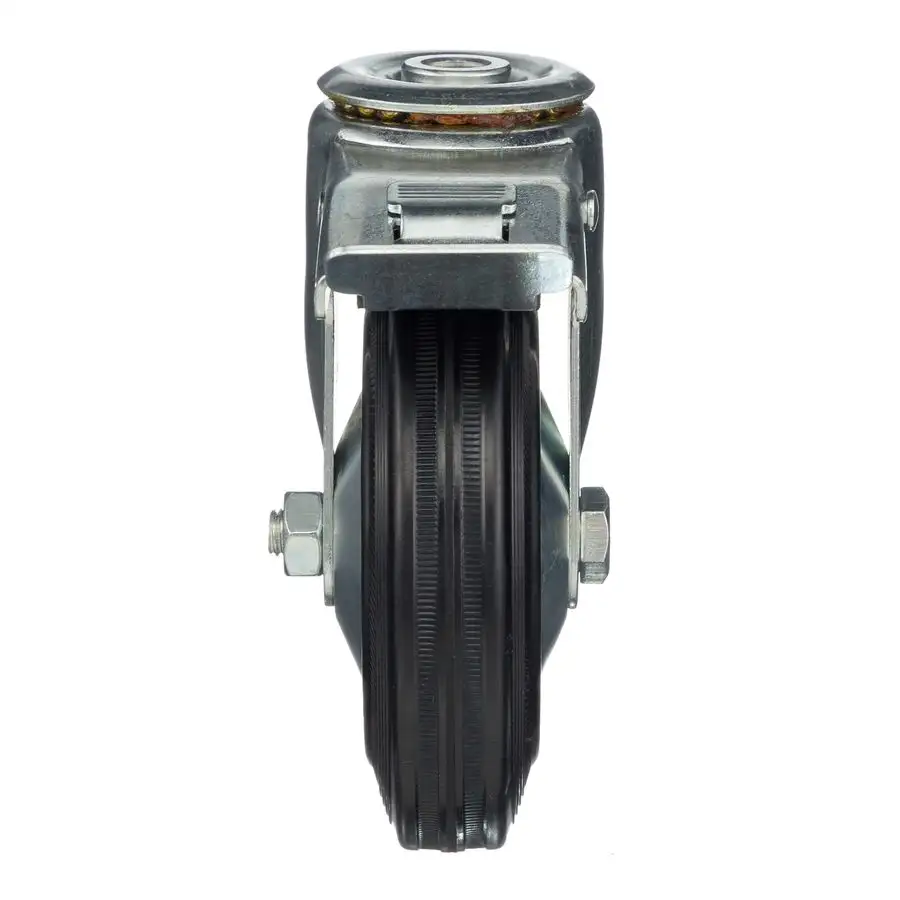 Промышленное поворотное колесо из высококачественной черной литой резины с металлическим сердечником (оцинкованный обод, выполненный из штампованной стали). Поворотная опора с отверстием под болт.