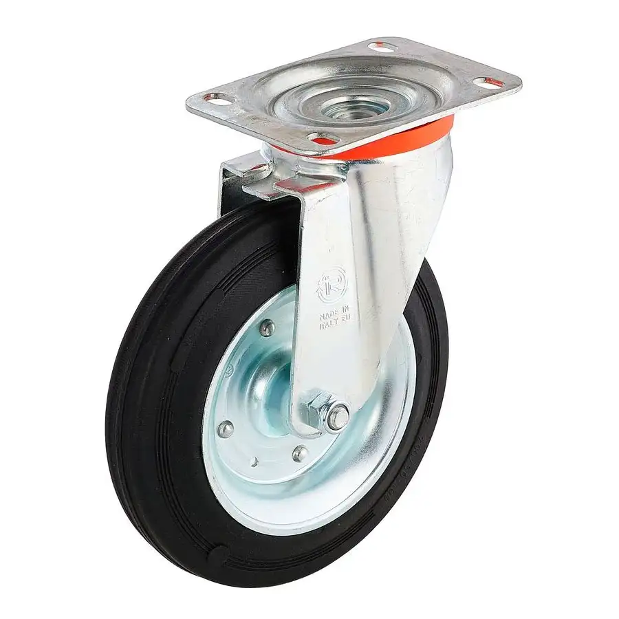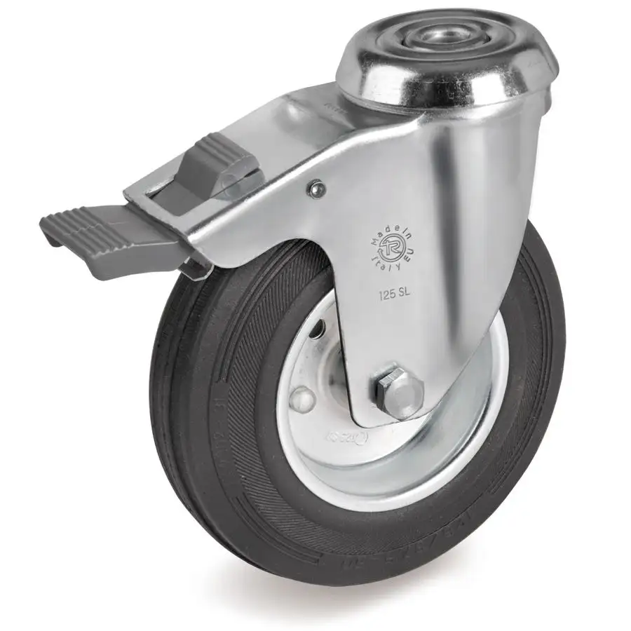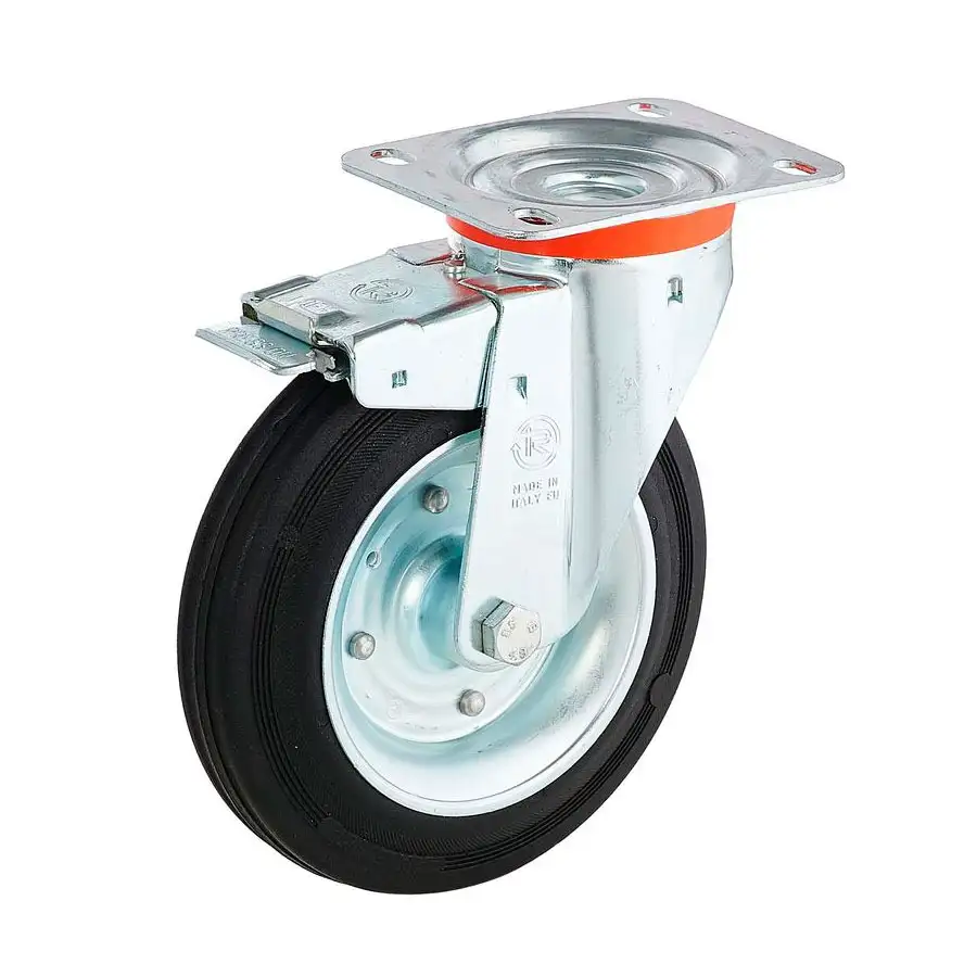 Промышленное поворотное колесо из черной резины с сердечником из высококачественной стали, наличие тормозного механизма.