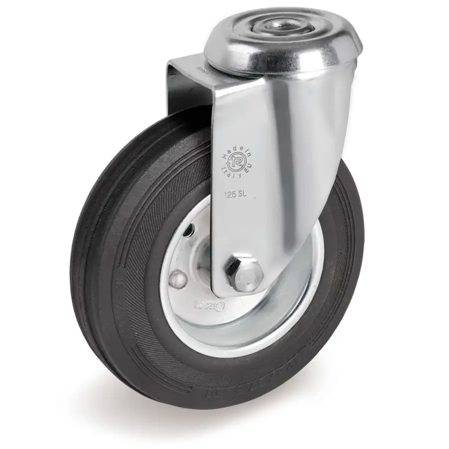 Промышленное поворотное колесо из черной резины со стальным центром.