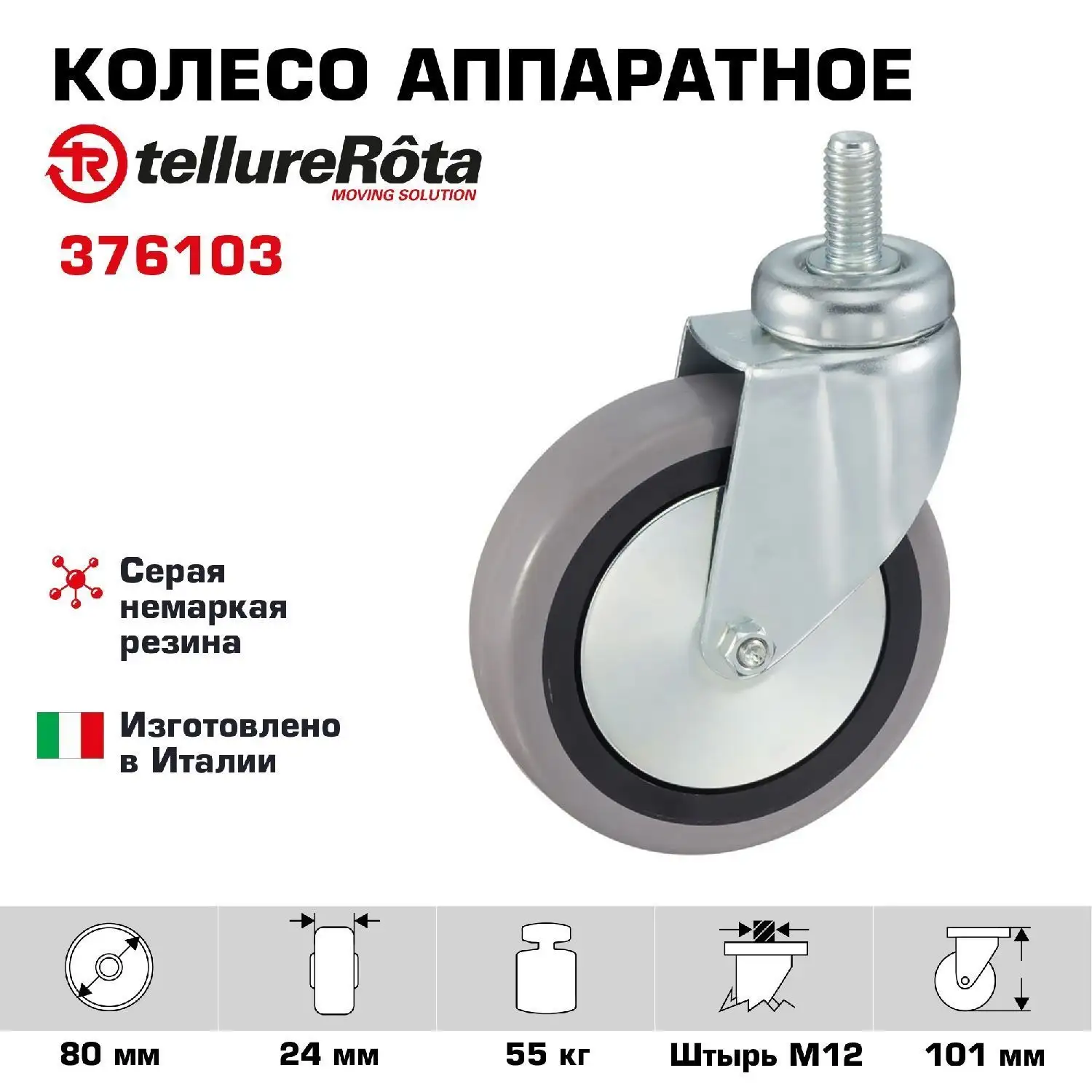 Колесо промышленное (80 мм; 55 кг) поворотное Tellure Rota, серая немаркая резина / полипропилен 374103