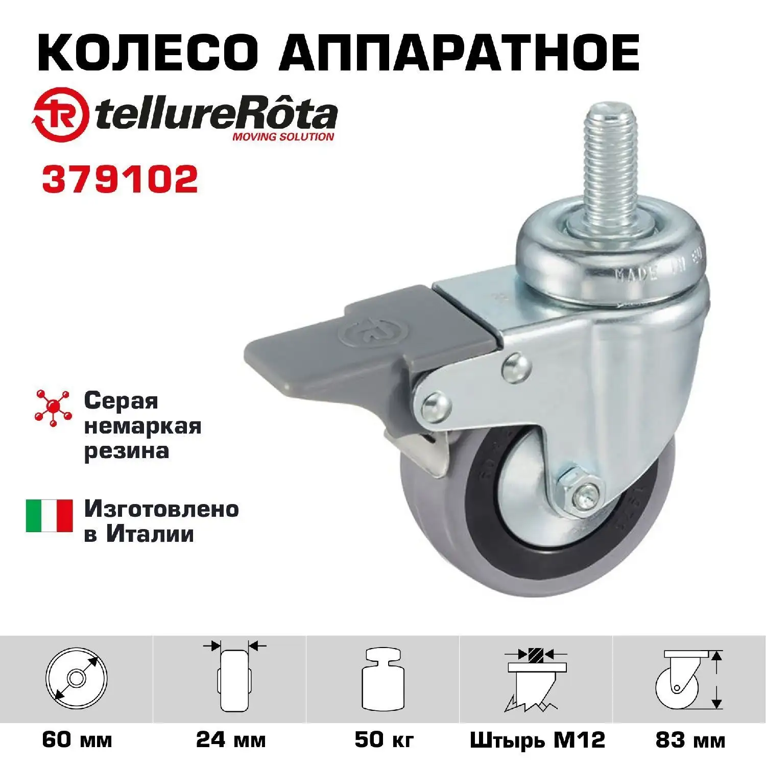 Колесо промышленное (60 мм; 50 кг) поворотное Tellure Rota, серая немаркая резина / полипропилен 374102