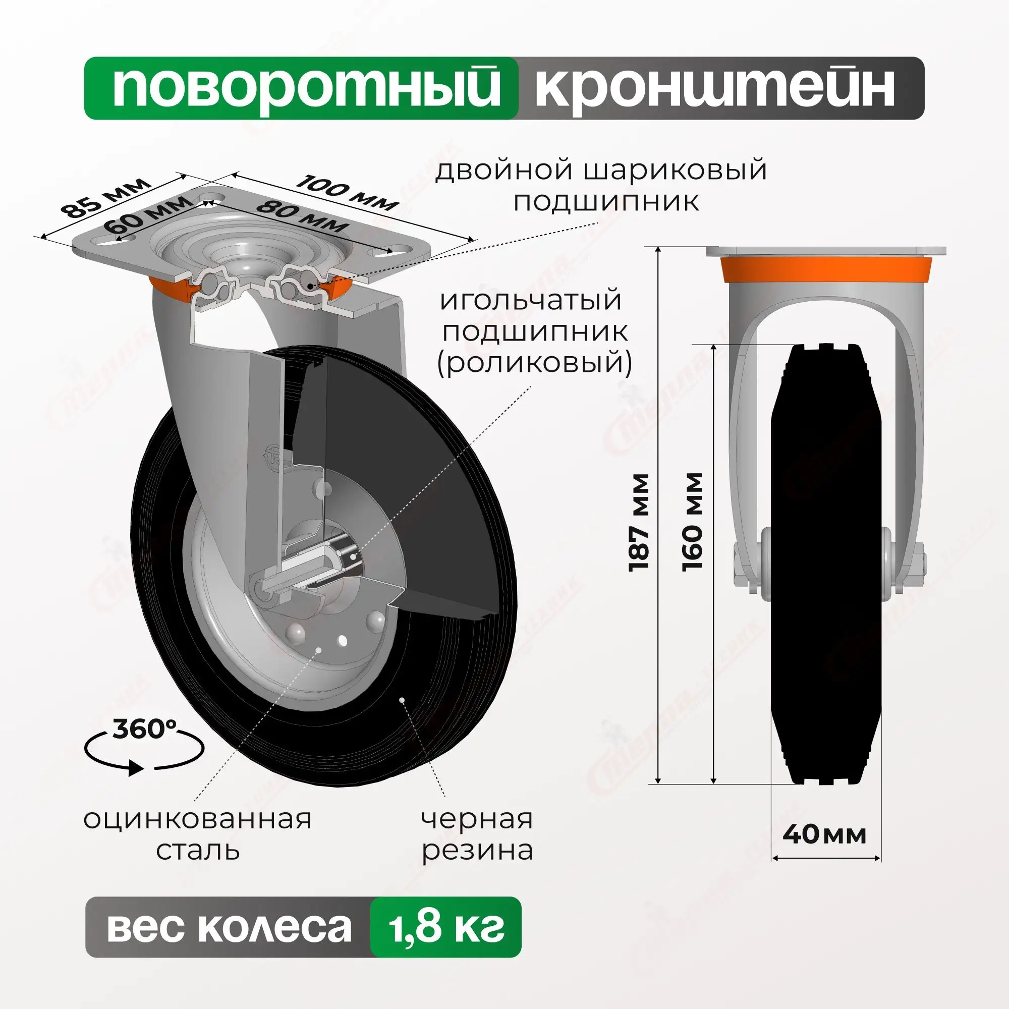 Колесо промышленное поворотное Tellure Rota, черная резина, сталь 535103