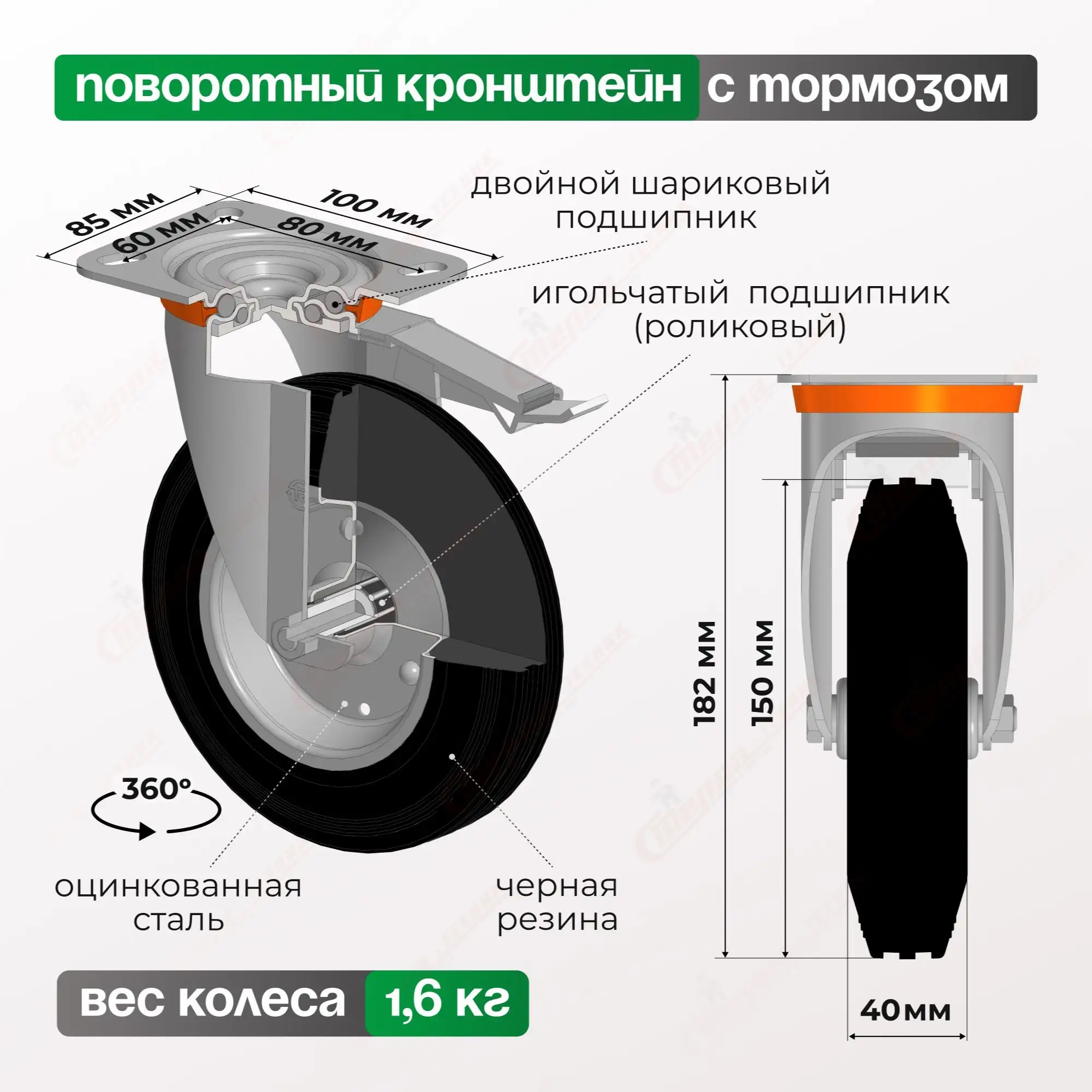 Колесо промышленное с тормозом Tellure Rota, черная резина, сталь 535431
