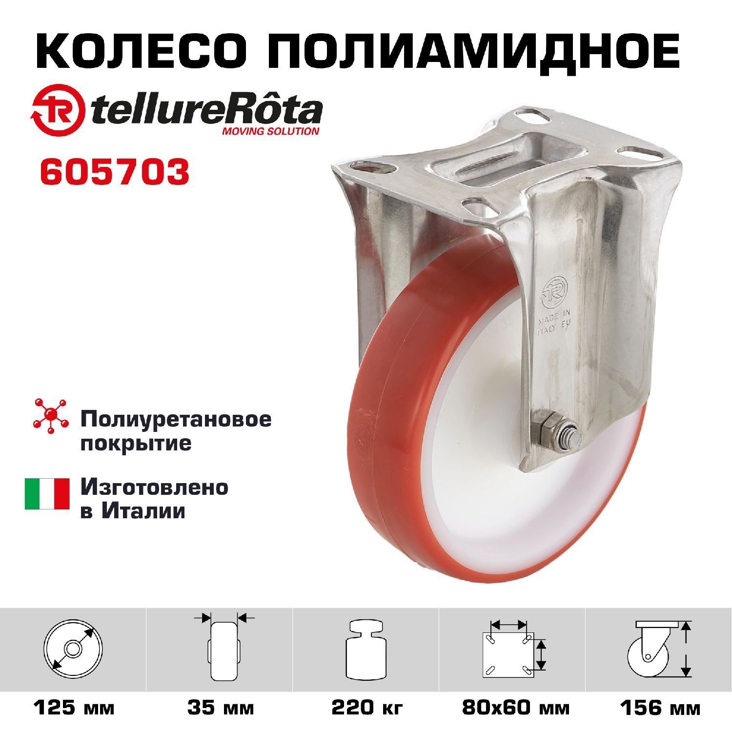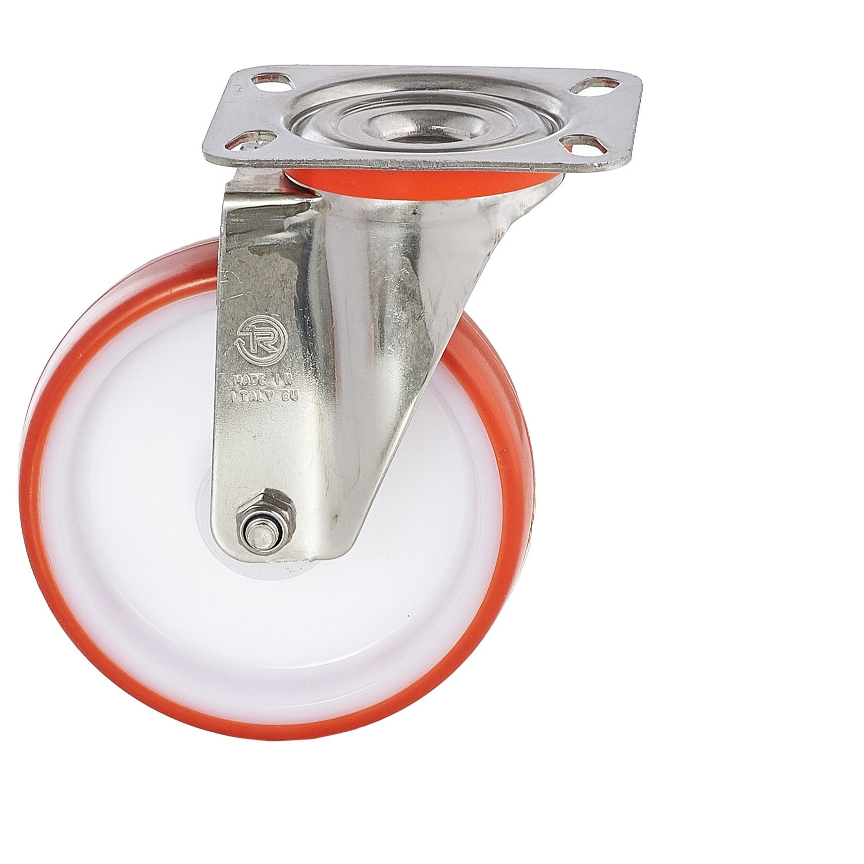 Полиуретановое колесо - надёжное решение для промышленного применения. Основа колеса выполнена из износостойкого полиамида 6, поверх которого нанесён слой термопластичного полиуретана твёрдостью 55 единиц по шкале Шора D. Поворотный кронштейн NL из оцинкованной стали с площадкой крепления под 4 болта оснащён современным двухрядным подшипником для плавного вращения.
