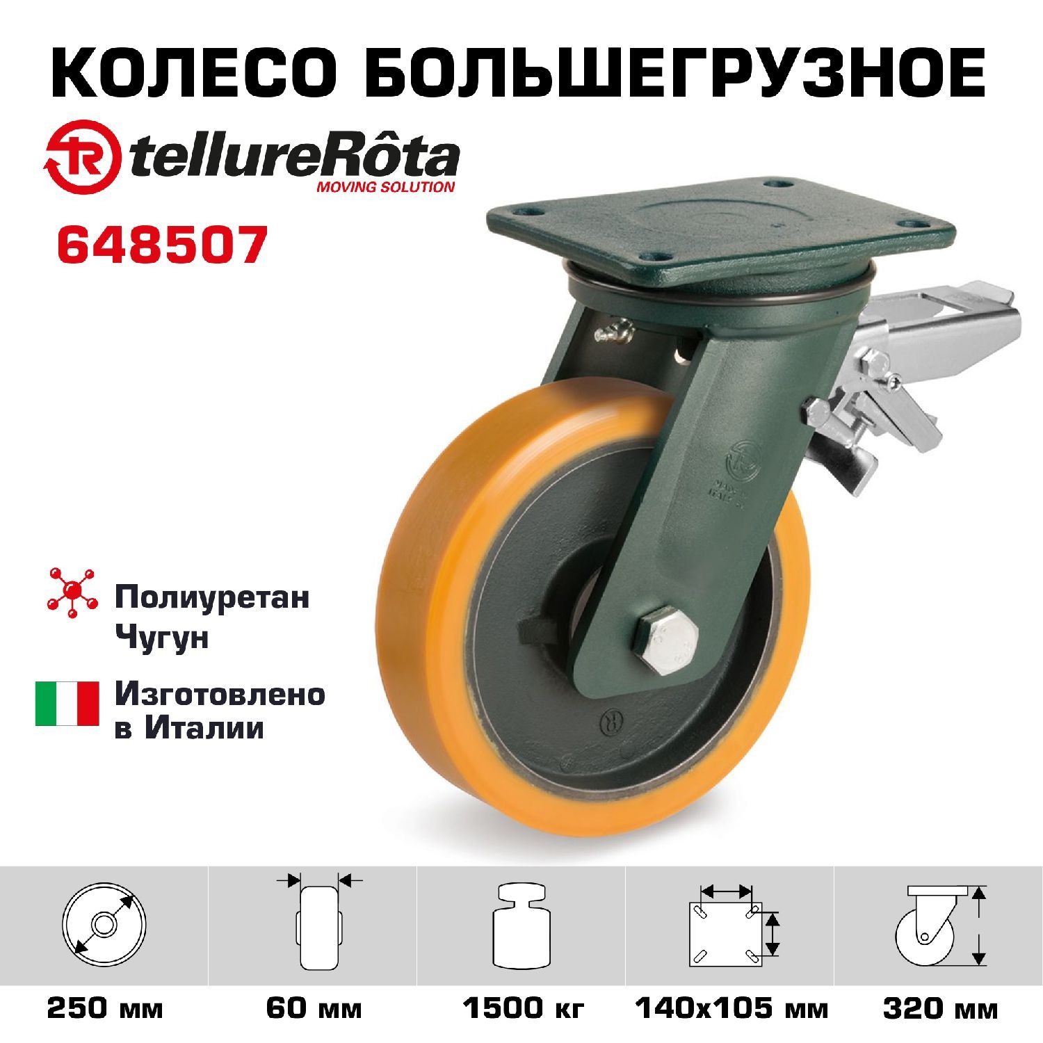 Колесо большегрузное (250 мм; 1500 кг) поворотное с тормозом Tellure Rota, полиуретан, чугун, шариковый подшипник 648507