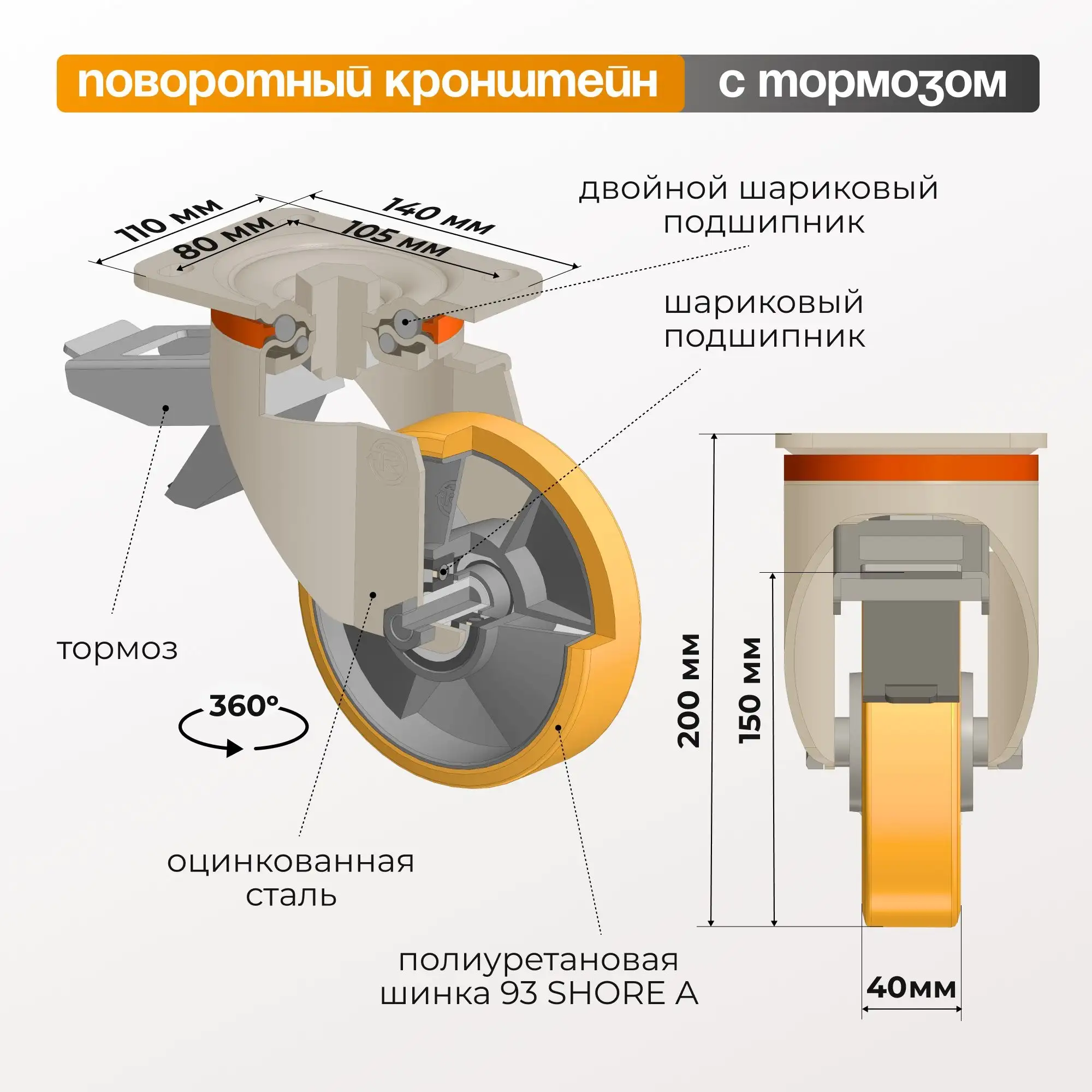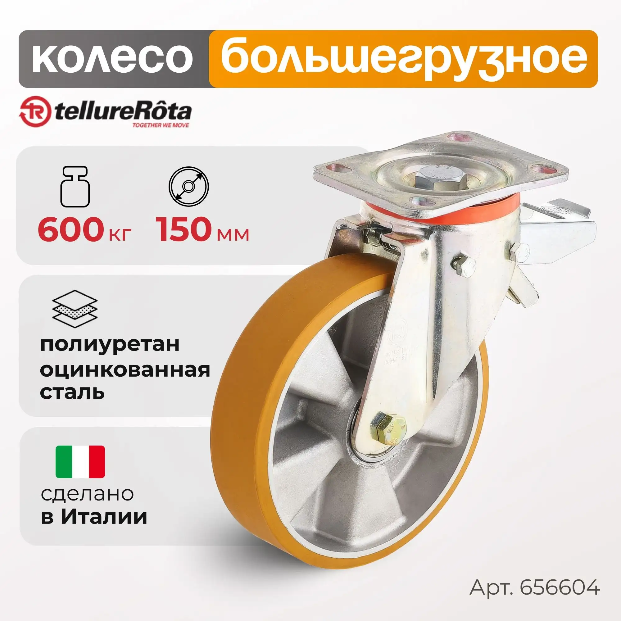 Колесо большегрузное полиуретановое (150 мм; 600 кг) поворотное с тормозом, полиуретан / алюминий 656604