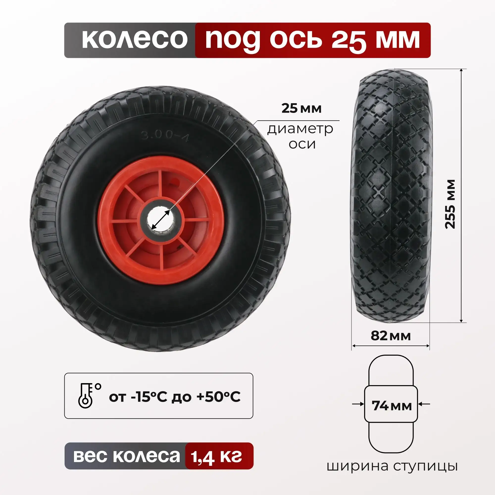 Колесо пенополиуретановое для тачки (255 мм, 100 кг, ось 25 мм) Стелла-техник 1120-255-4
