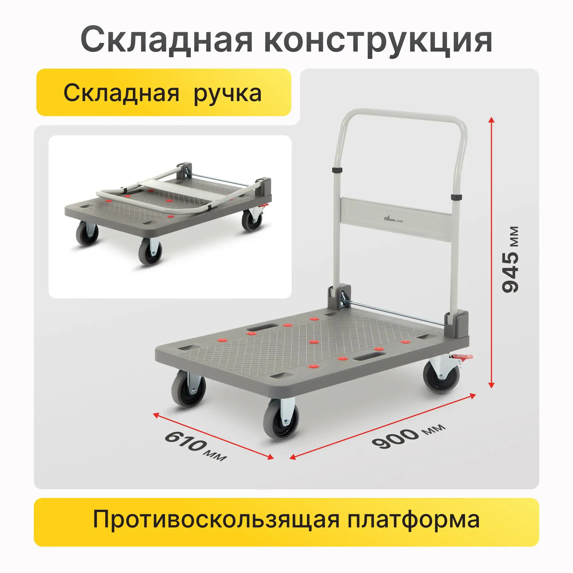Ручные тележки имеют прочные алюминиевые рамы. Для перевозки грузов применяются решетчатые платформы. Площадки легко откидываются и при необходимости быстро складываются.