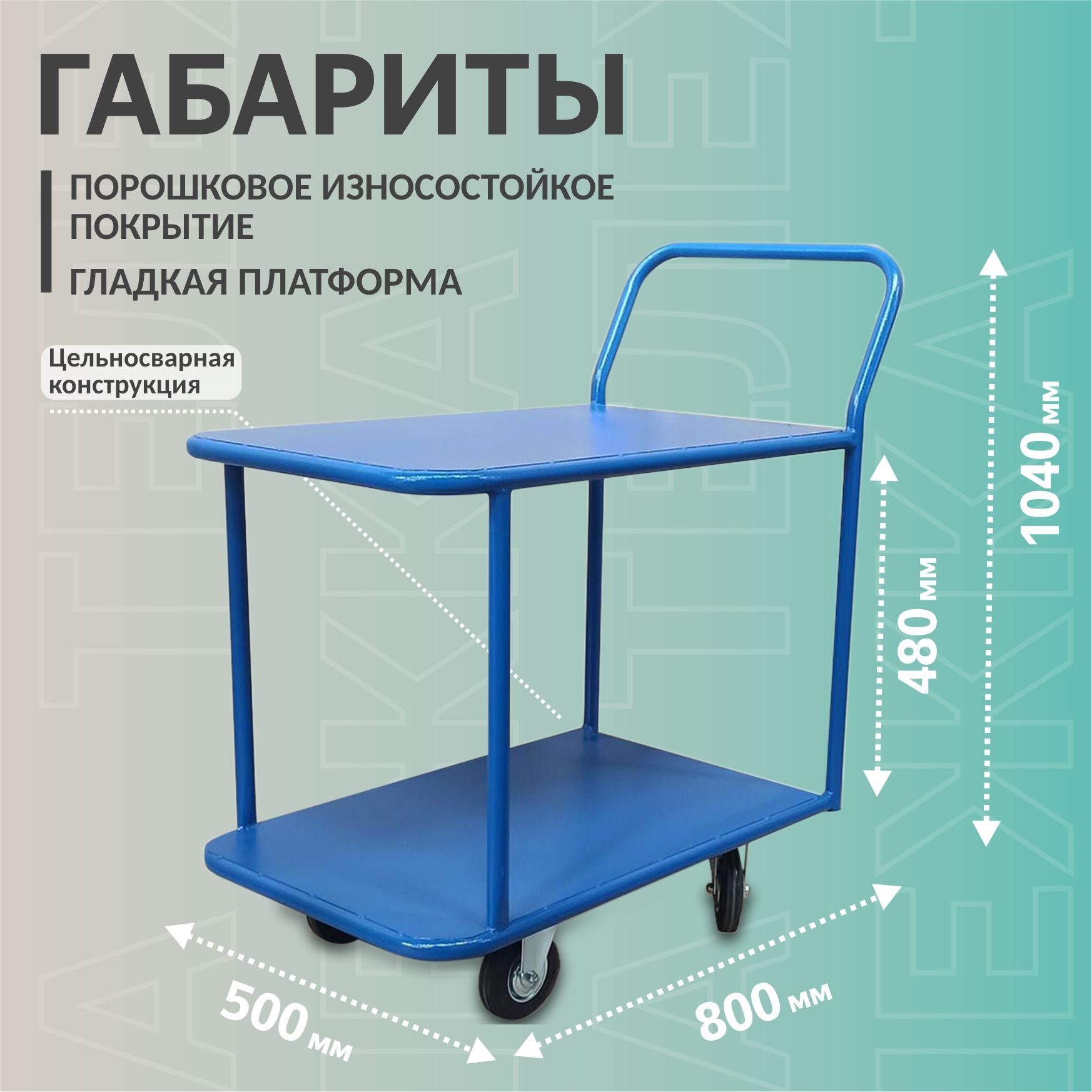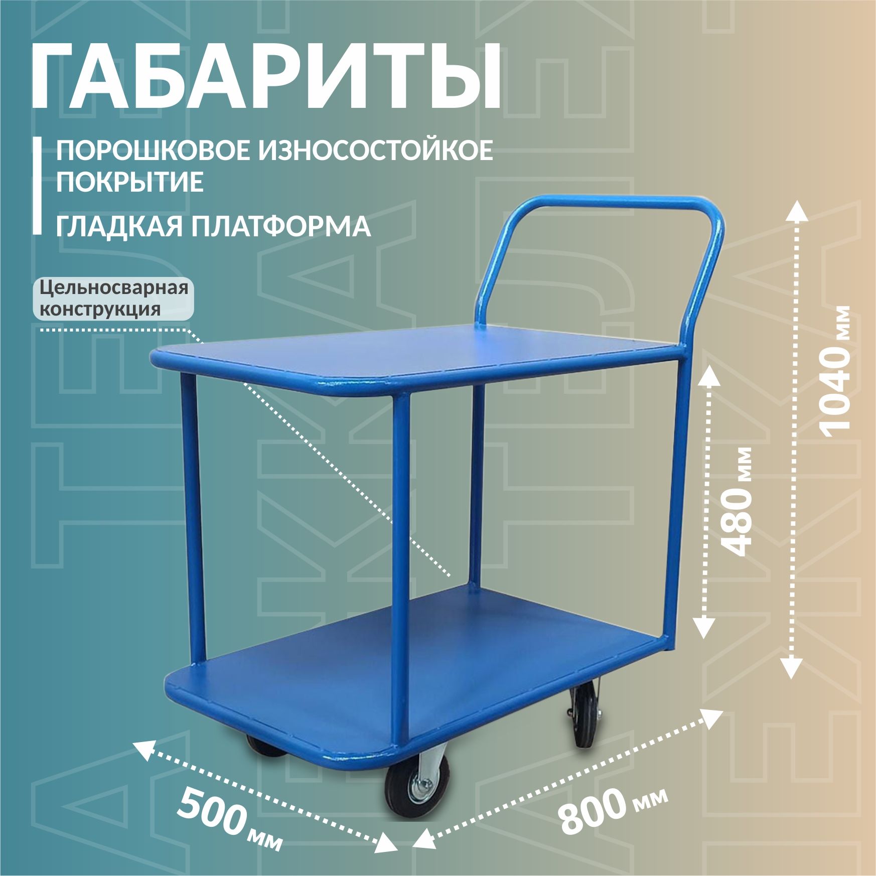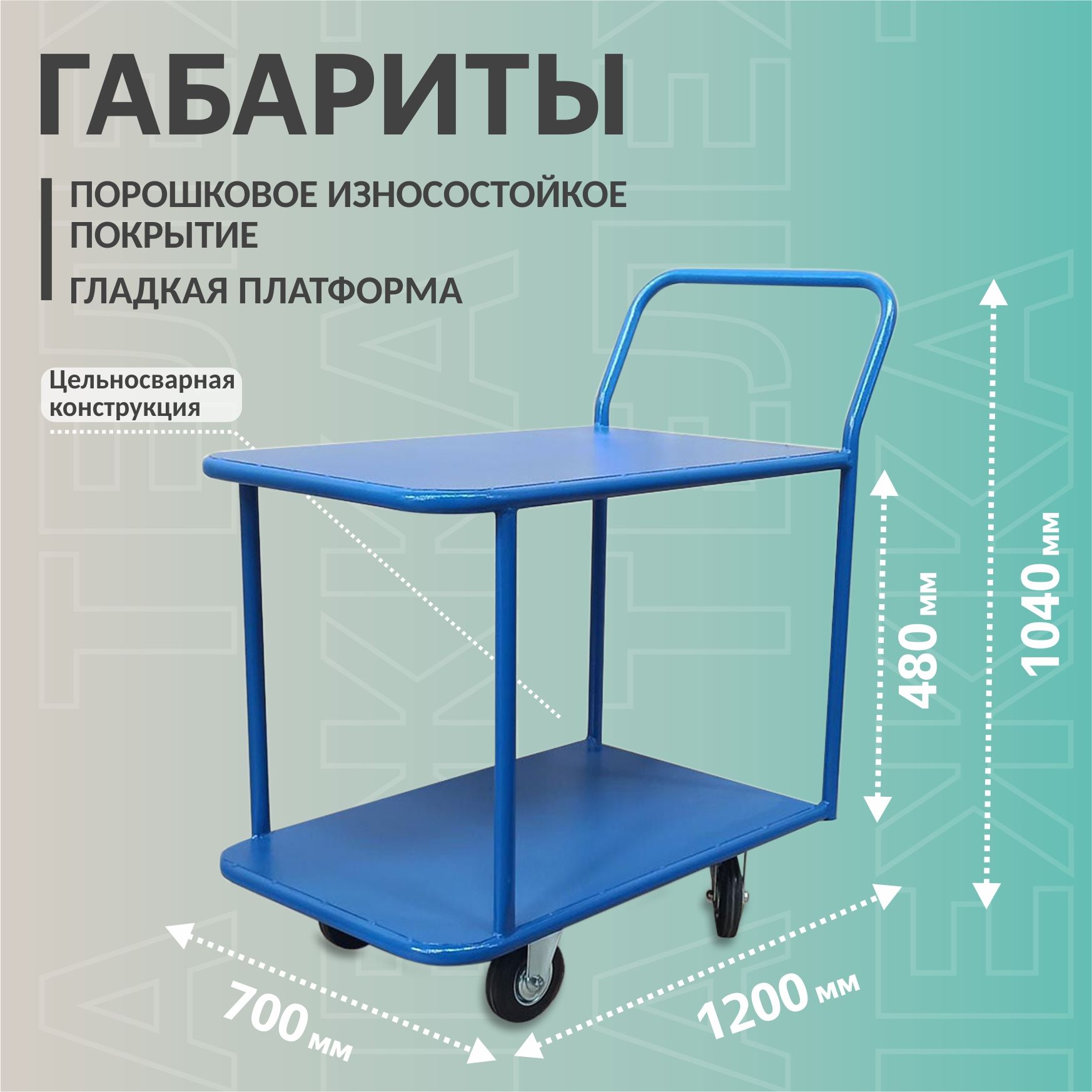 Каркас и платформы выполнены из прочного металла. Каждая платформа имеет размеры 700 на 1200 миллиметров, а расстояние между двумя уровнями составляет 480 миллиметров. Общая высота изделия достигает 1050 миллиметров. Полимерное синее покрытие защищает все металлические элементы от коррозии. Двухъярусная система позволяет оптимально использовать пространство и одновременно транспортировать различные грузы.