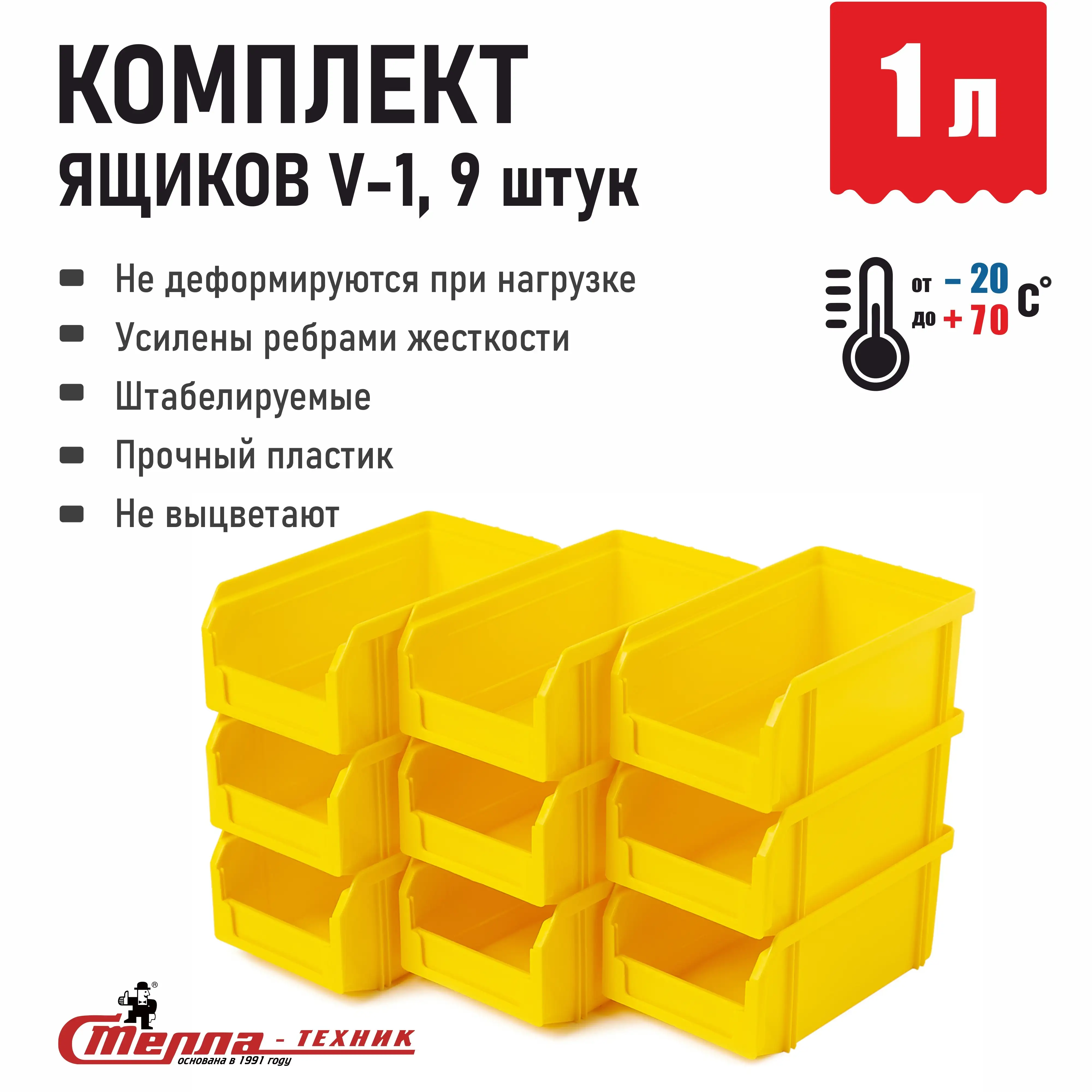 Складской пластиковый ящик, лоток для метизов Стелла-техник 171х102х75 мм, 1 л, комплект 9 шт. V-1-К9-желтый