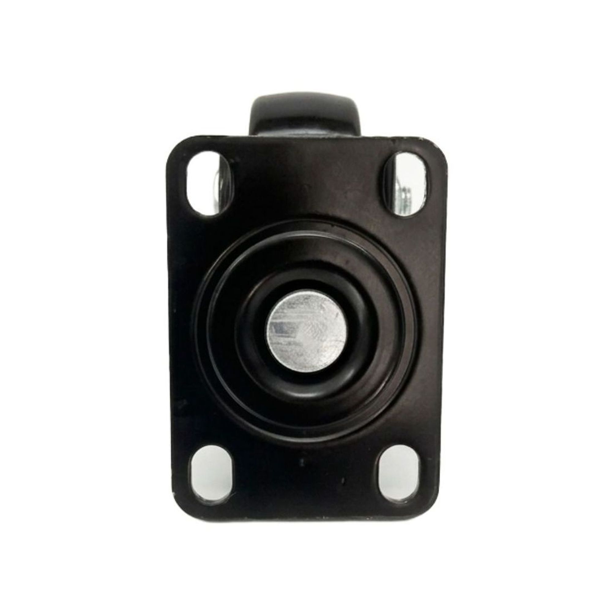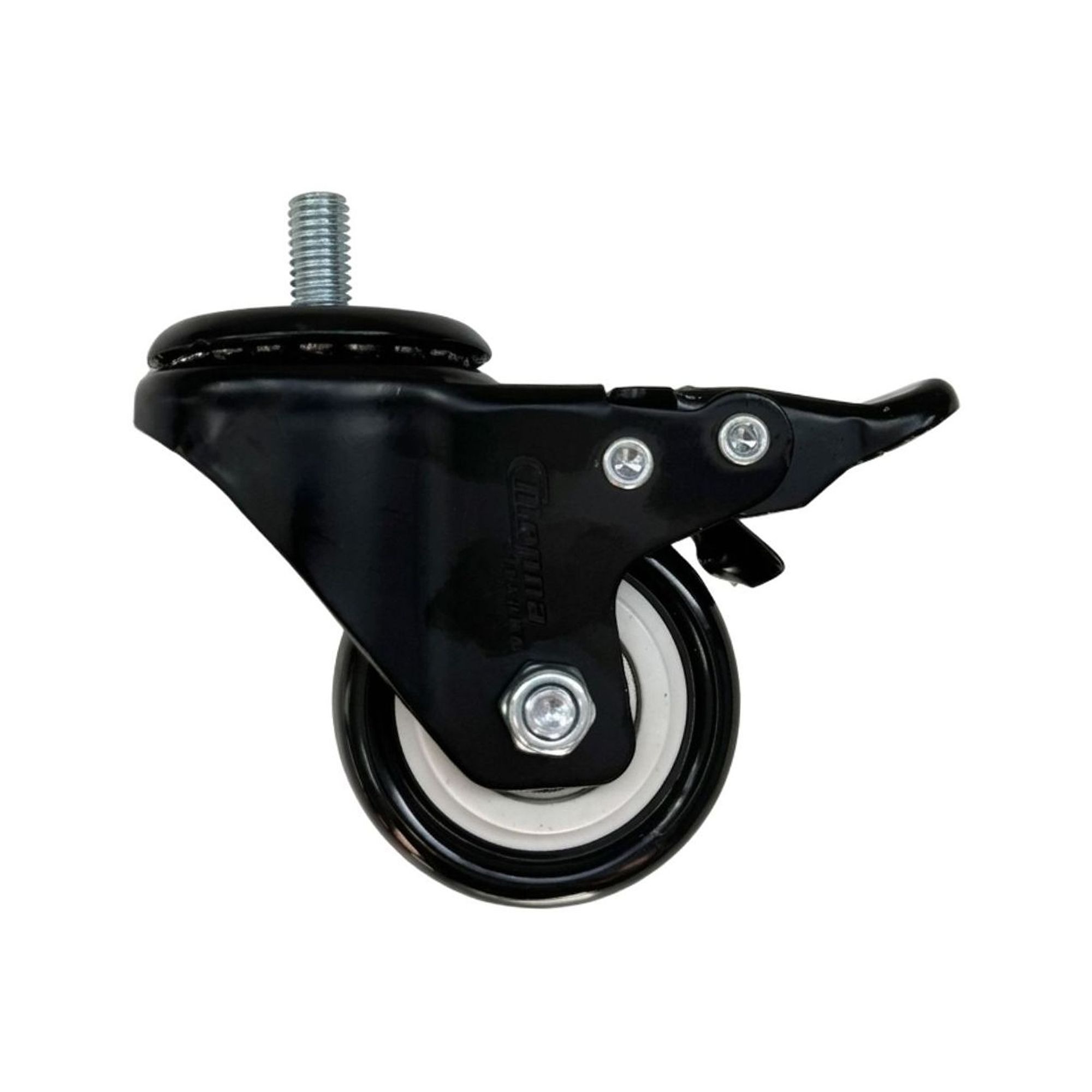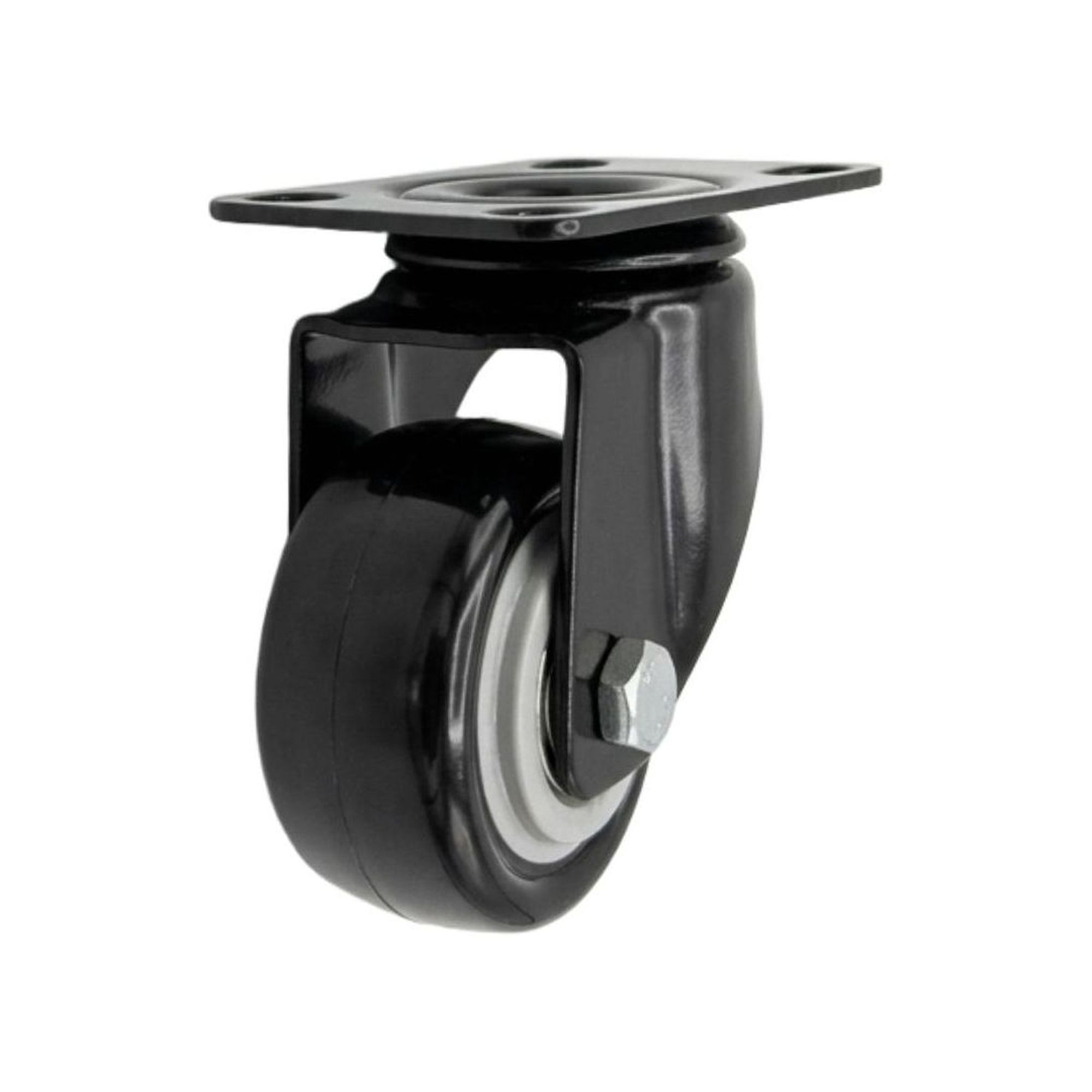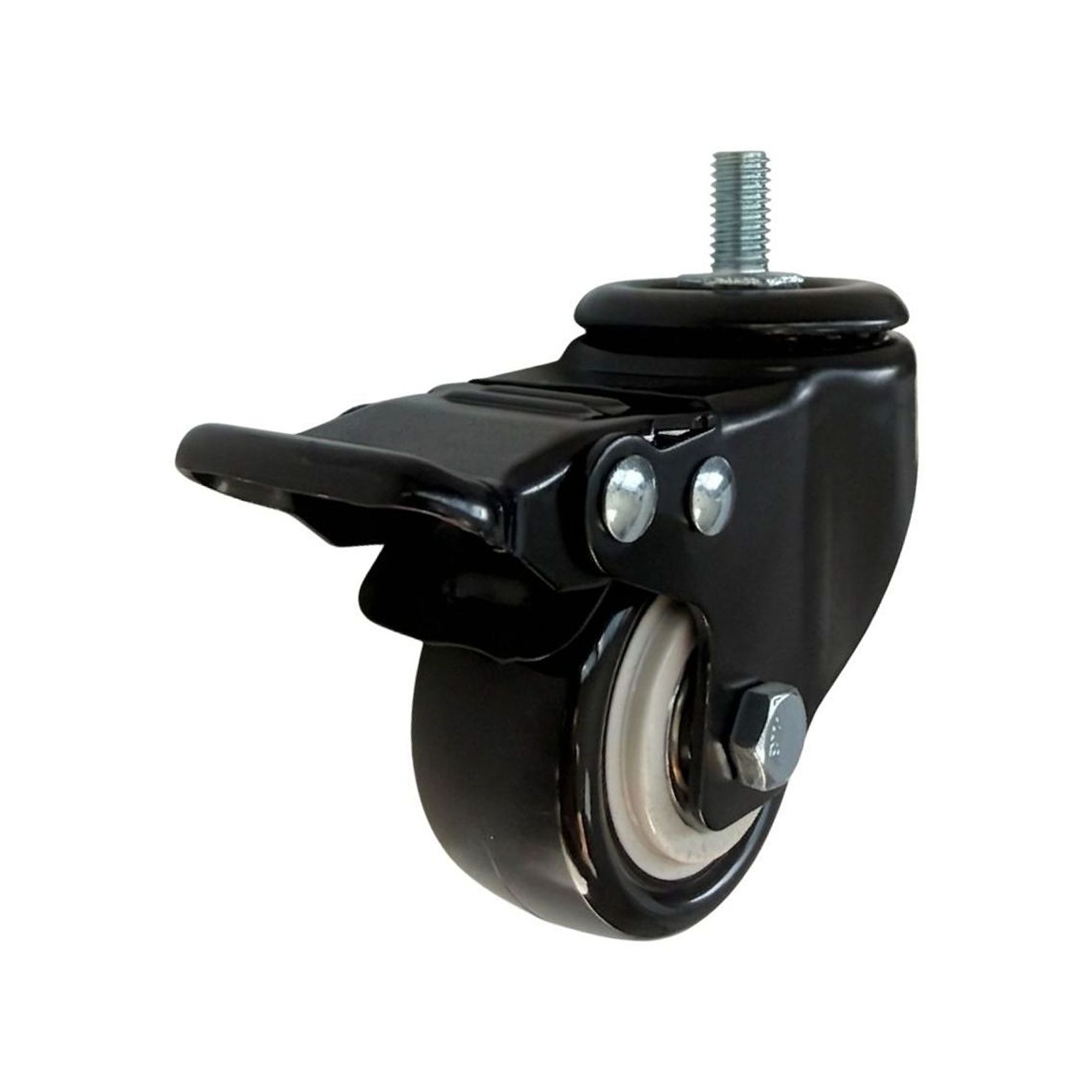 Колесо поворотное с тормозом с кронштейном из стали, покрытое качественной эмалью черного цвета. Контактный слой из ПВХ твердостью 95 Шор A. Основание: Полипропилен. Ступица оснащена двухсторонним шарикоподшипником.