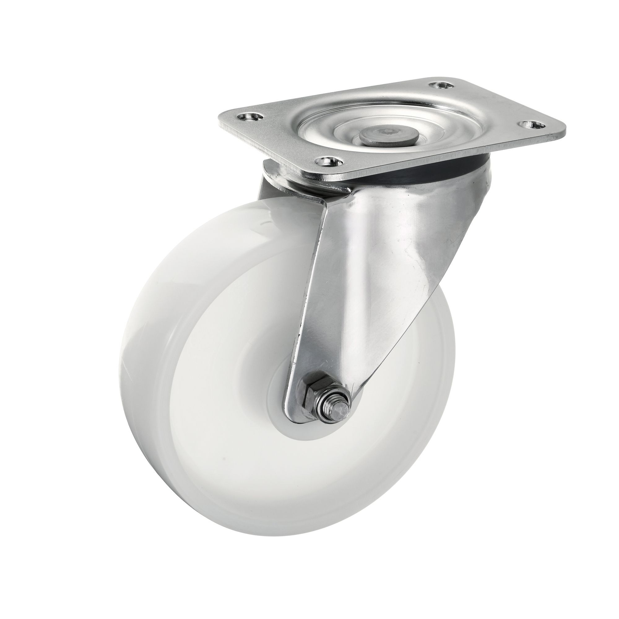 Цельнолитое колесо из полиамида твердостью 70 Шор D. В оси расположен подшипник скольжения, обеспечивающий комфортное передвижение. Полиамидные колеса оптимизированы для перемещения в условиях, требующих сочетания прочности, устойчивости к агрессивной химической среде и гигиеничности.