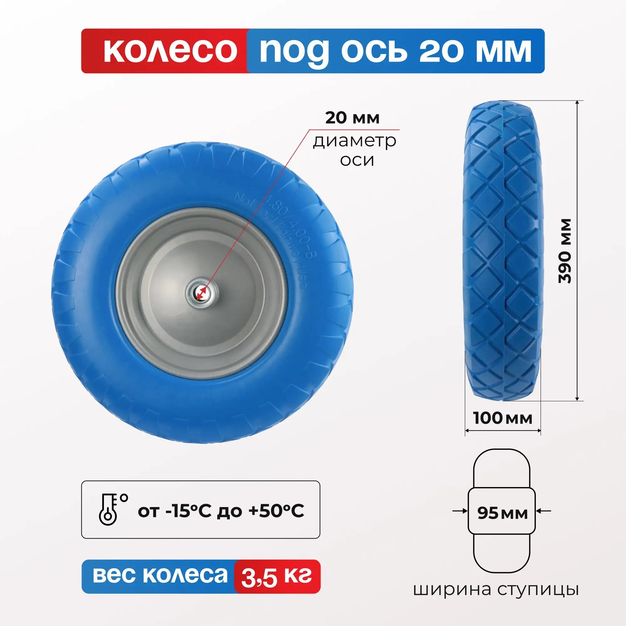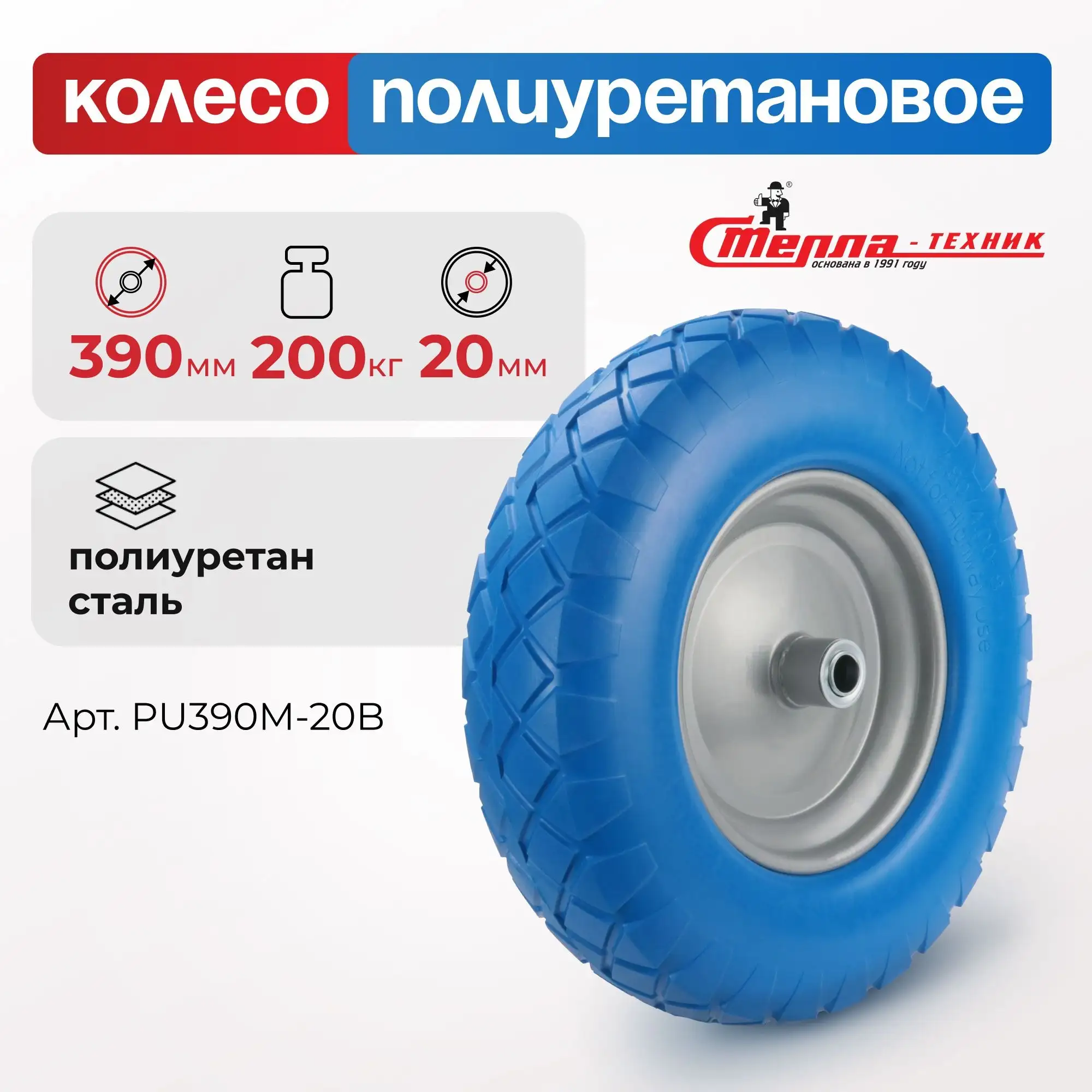Колесо пенополиуретановое для тачки (390 мм, 200 кг, ось 20 мм) Стелла-техник PU390M-20B