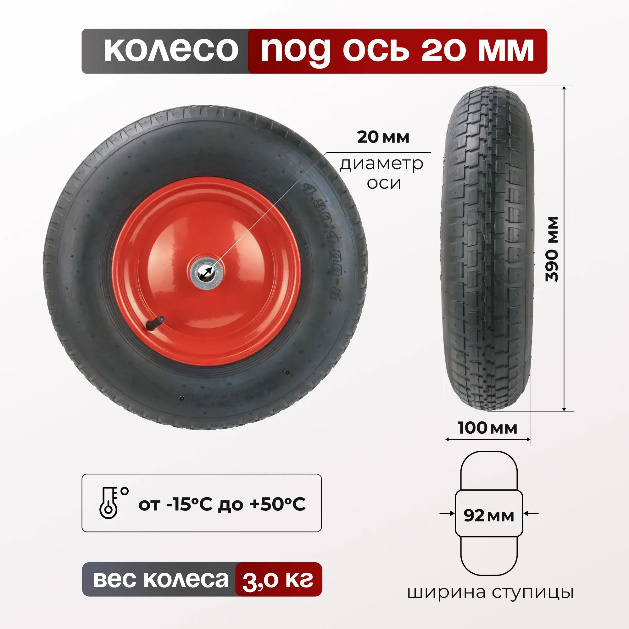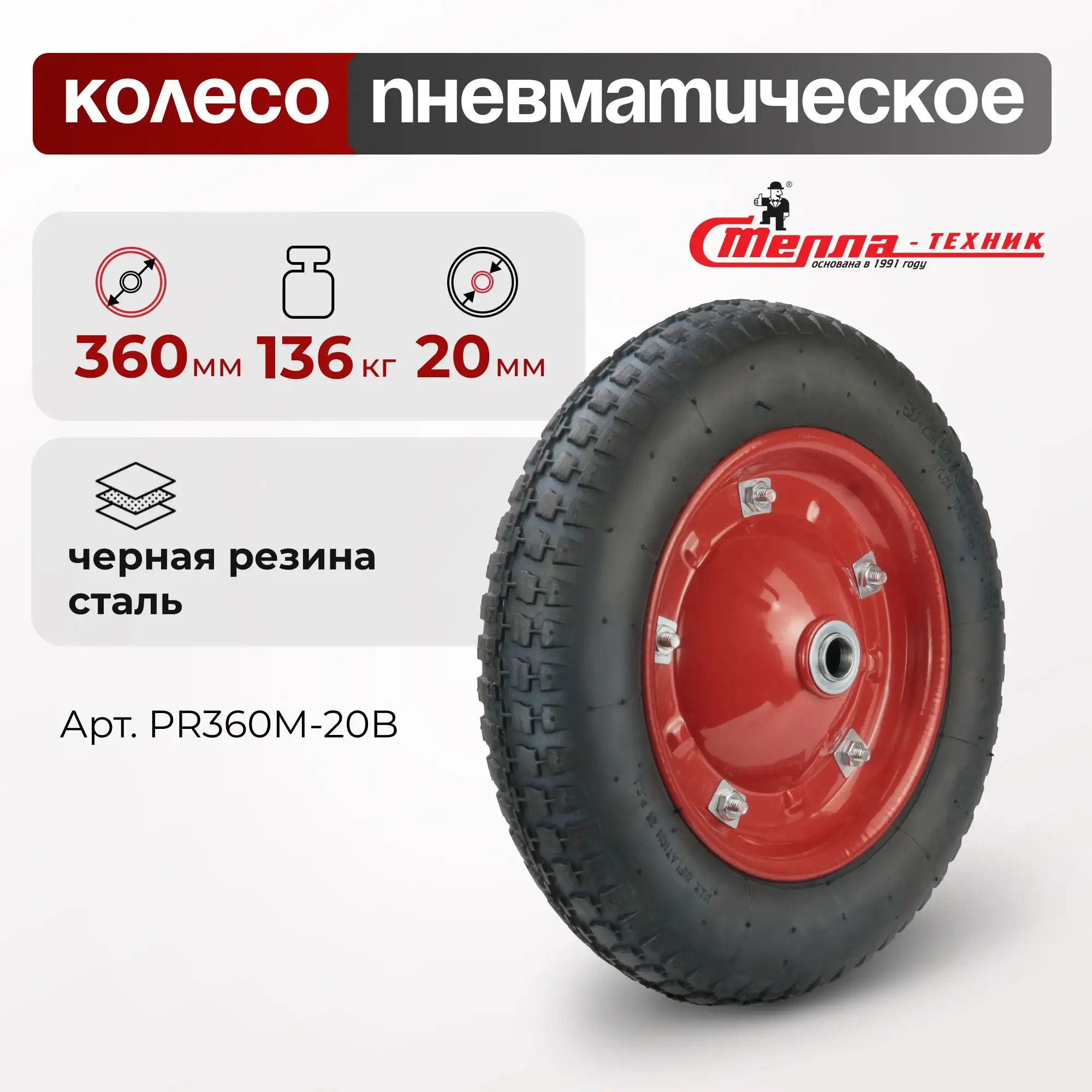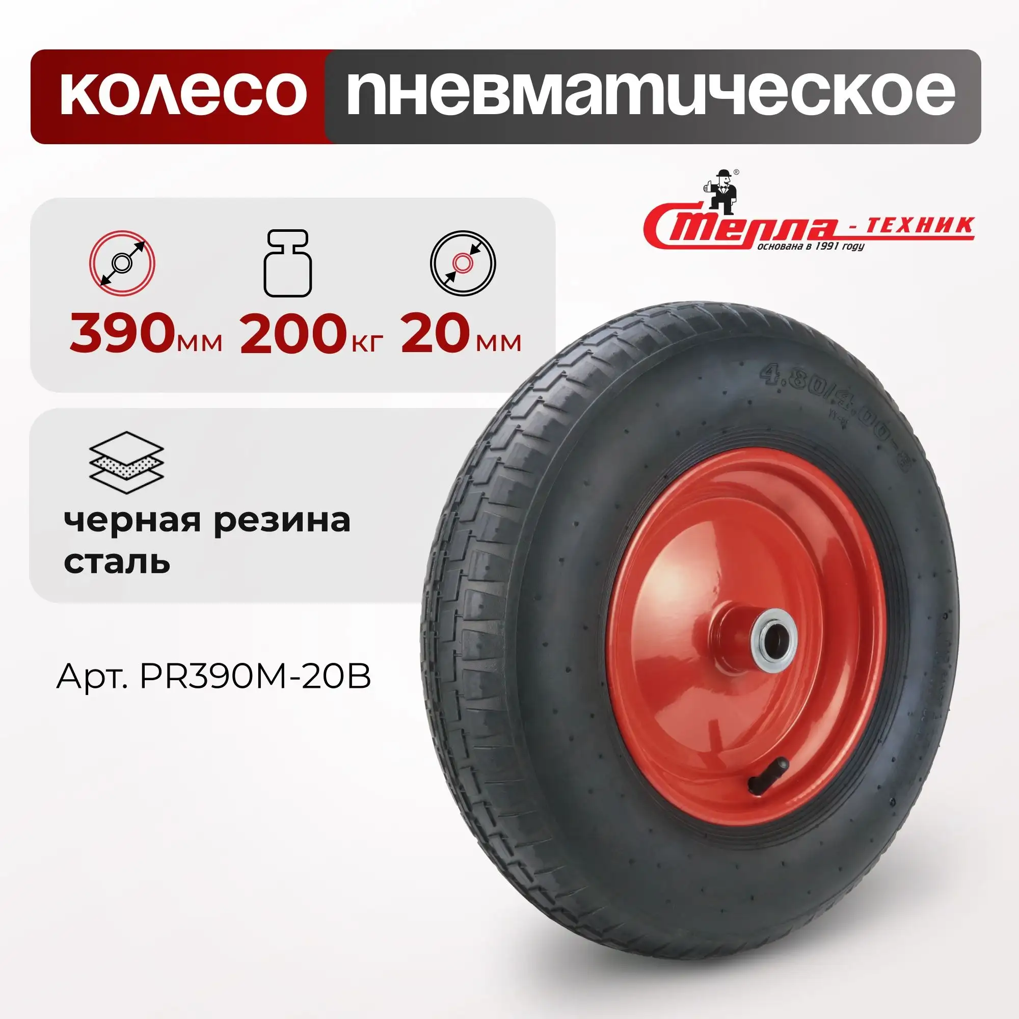 Колесо пневматическое (390 мм, 200 кг) под ось 20 мм Стелла-техник PR390M-20B