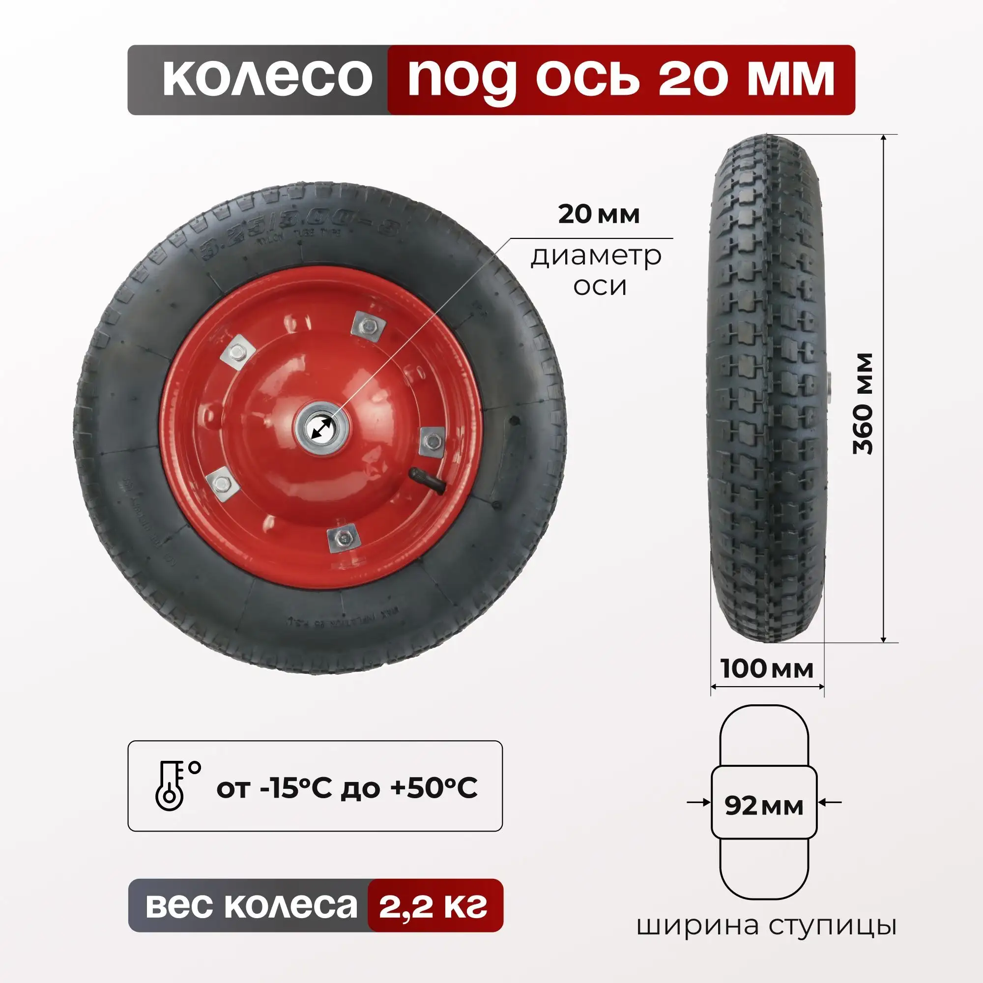 Колесо пневматическое (360 мм, 136 кг) под ось 20 мм, ассиметричная ступица, Стелла-техник PR360M-20B