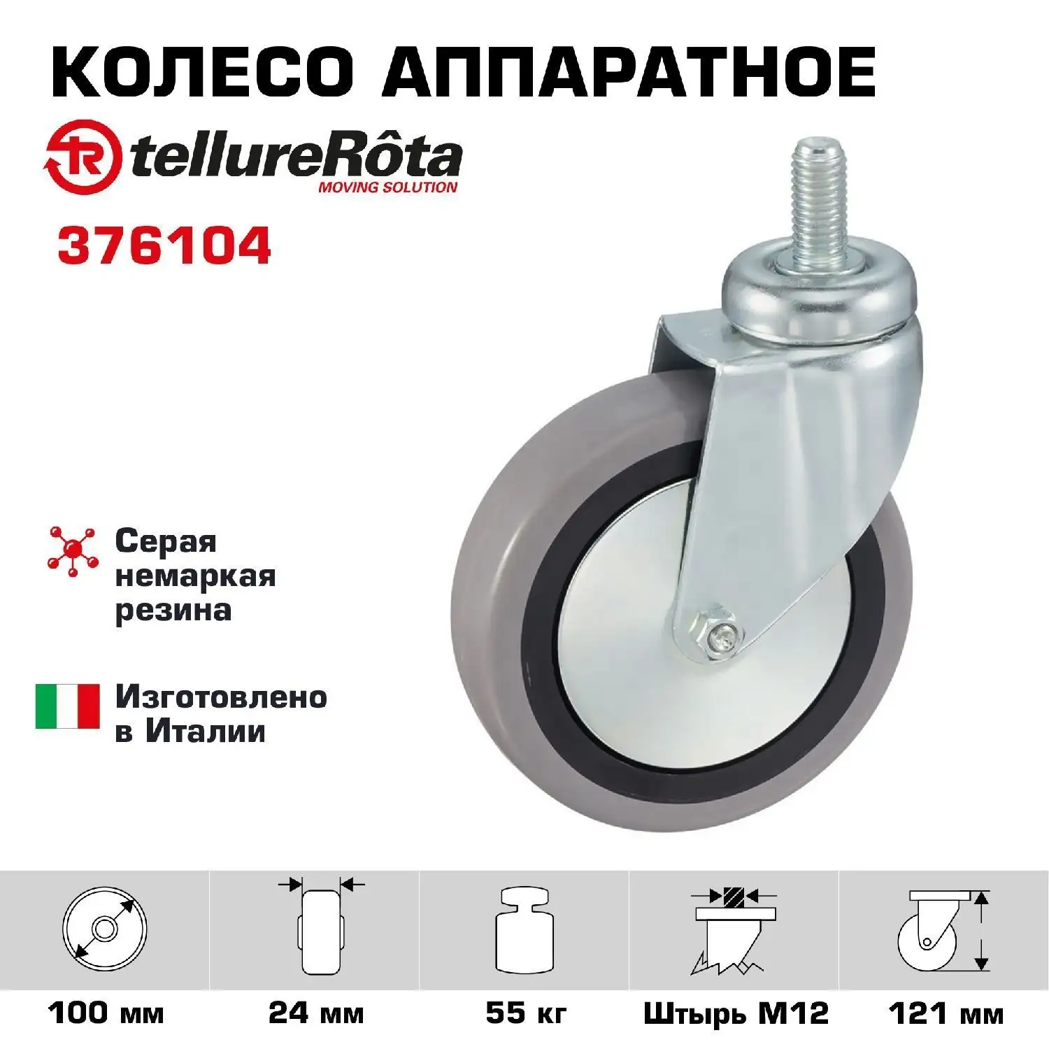Колесо промышленное поворотное (100 мм; 55 кг) Tellure Rota, серая немаркая резина / полипропилен 376104