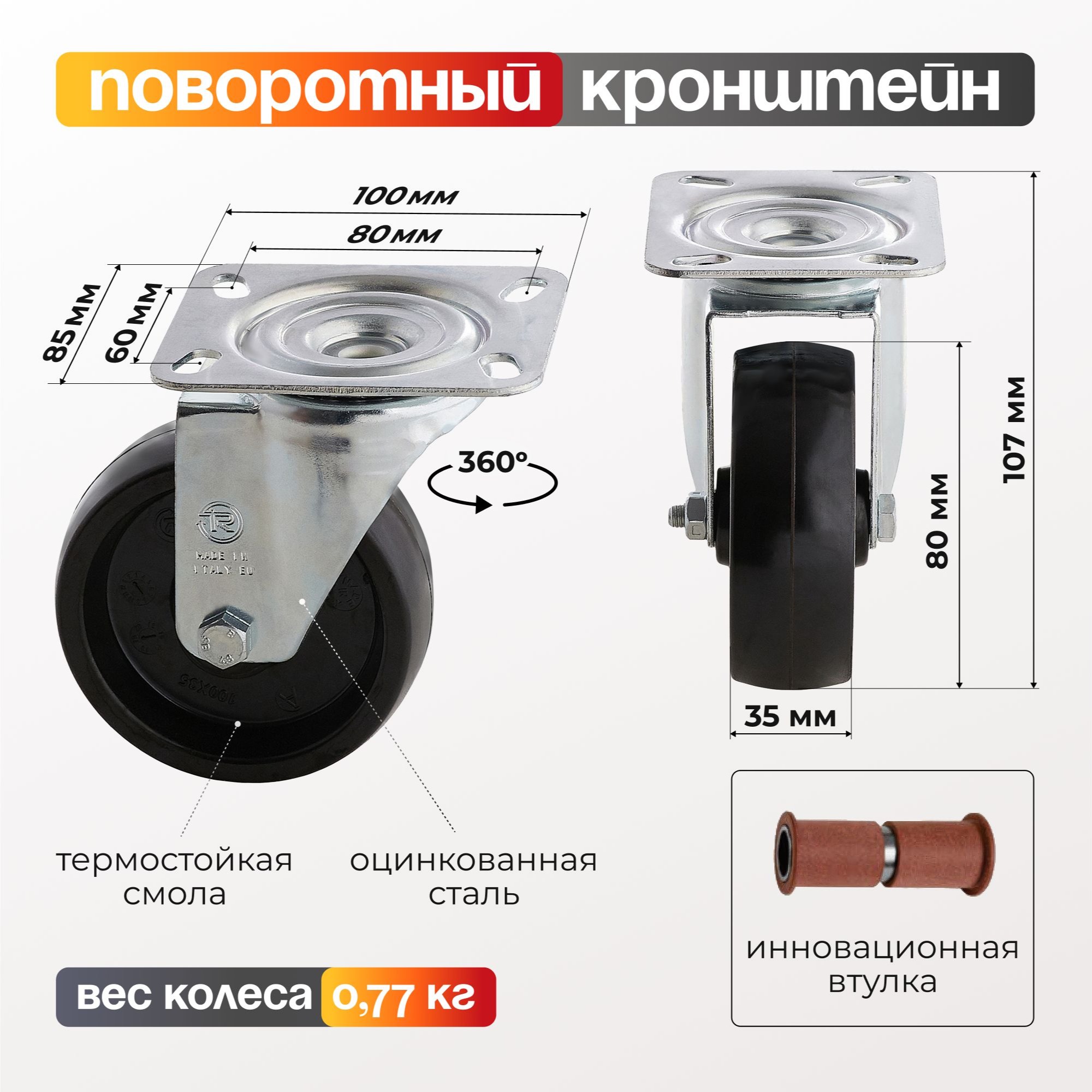 Колесо термостойкое (80 мм; 150 кг) поворотное Tellure Rota, фенольное до 300°С, инновационная втулка 677401