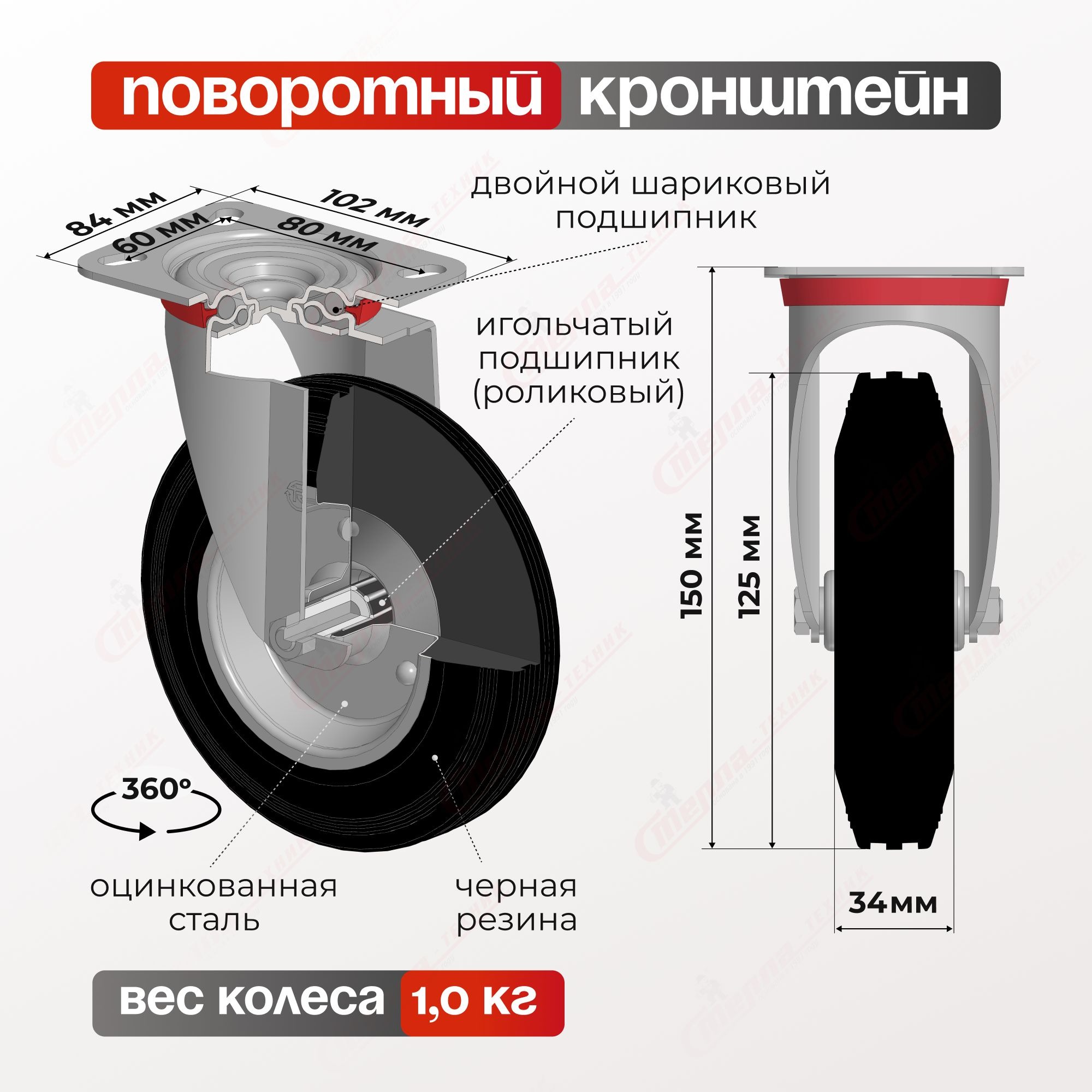 Колесо промышленное (125 мм, 100 кг) поворотное Стелла-техник 4001-125