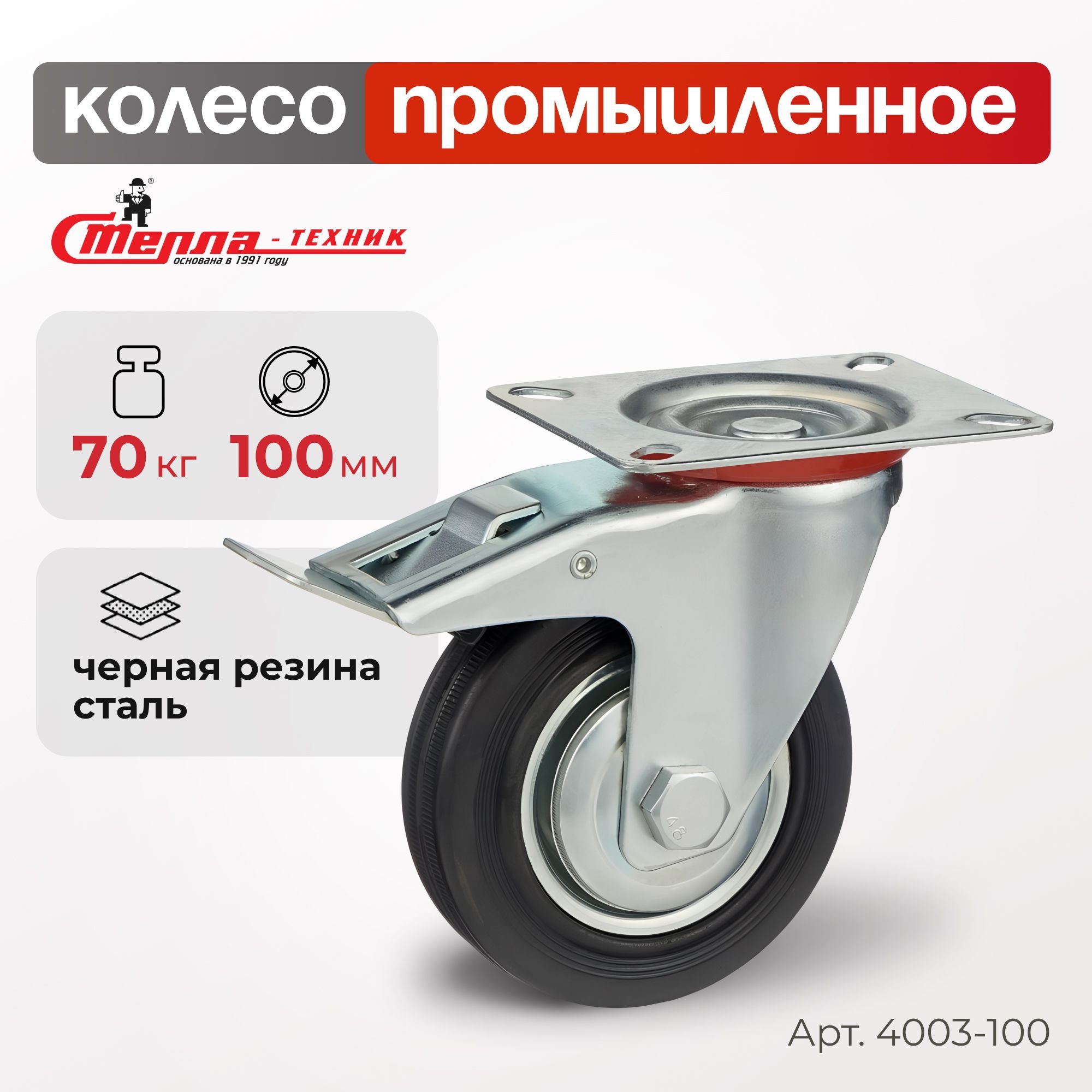 Колесо промышленное (100 мм, 70 кг) поворотное с тормозом Стелла-техник 4003-100