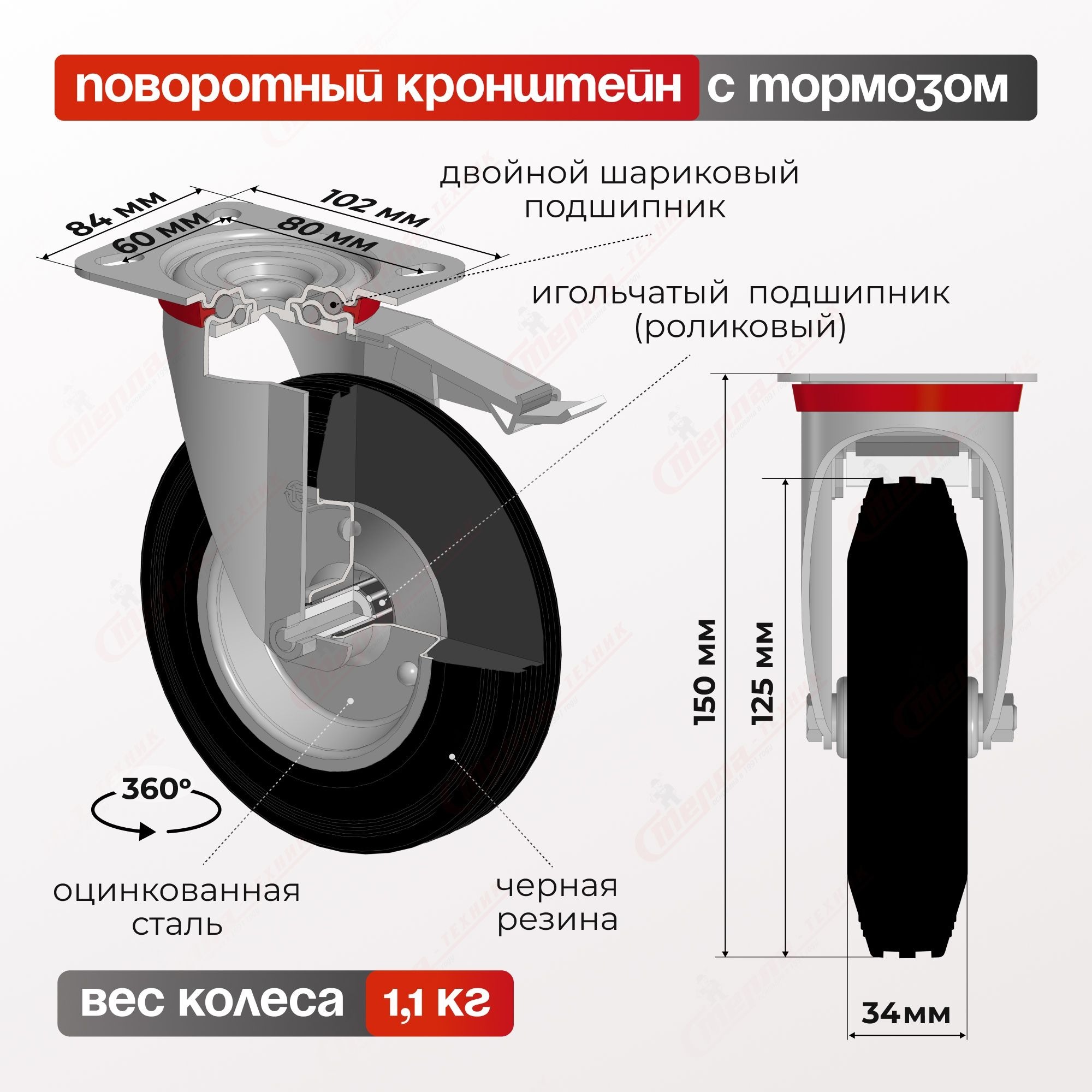 Колесо промышленное (125 мм, 100 кг) поворотное с тормозом Стелла-техник 4003-125
