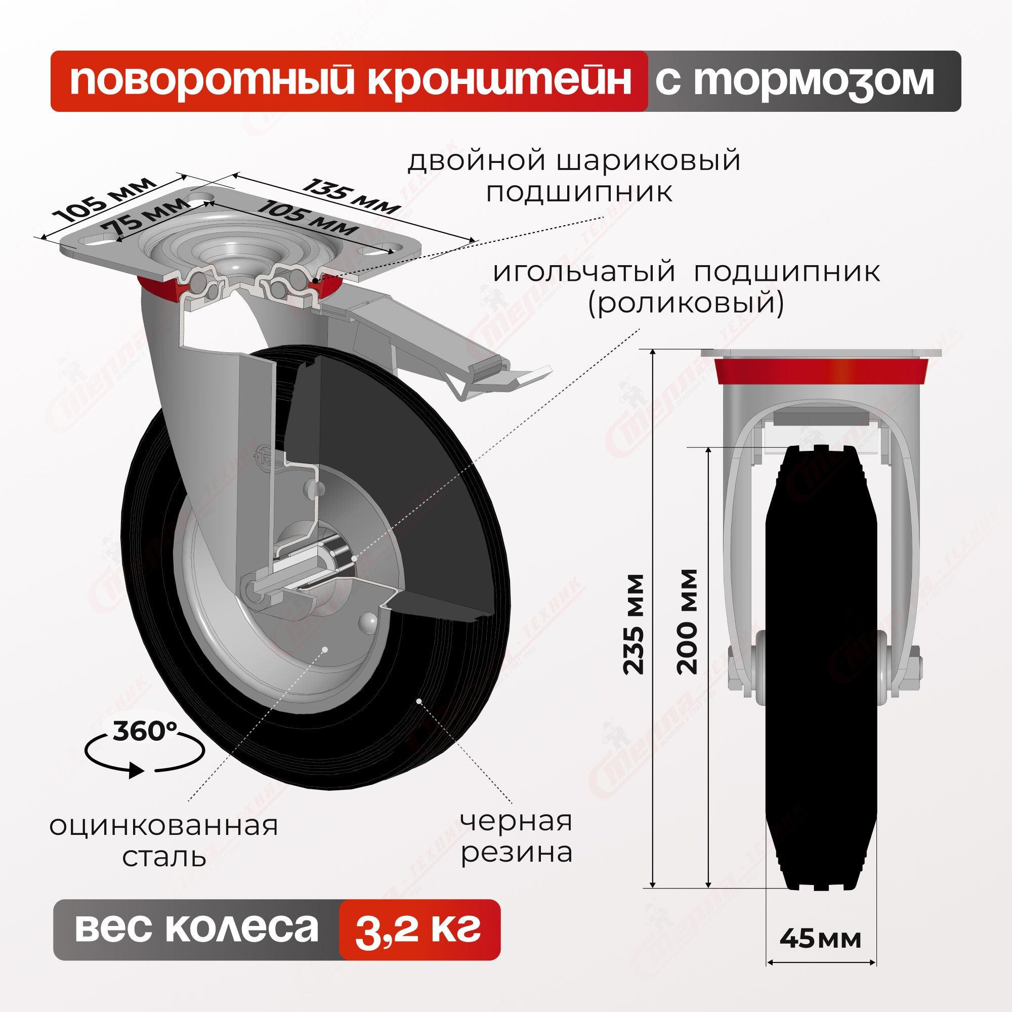 Колесо промышленное (200 мм, 185 кг) поворотное с тормозом Стелла-техник 4003-200