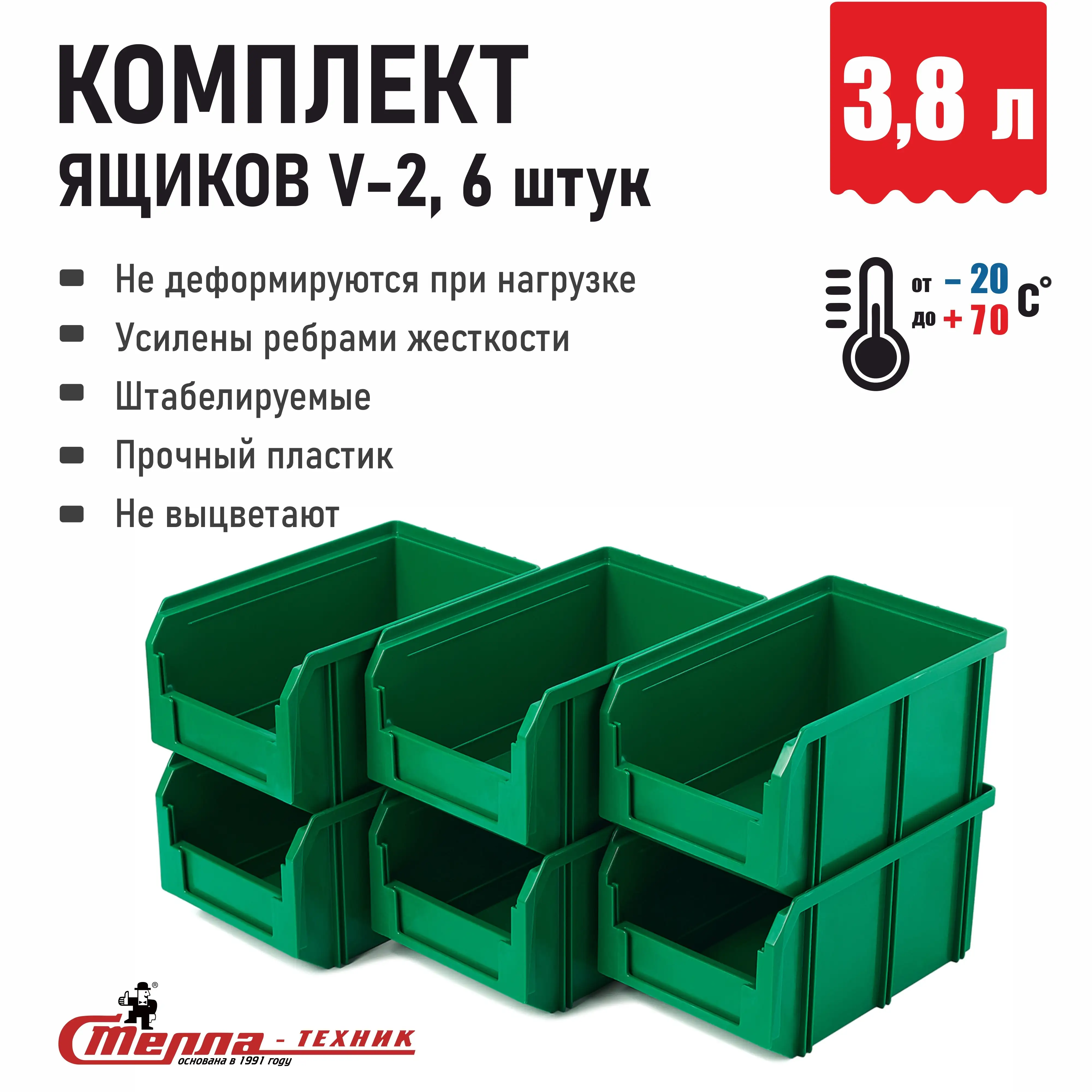 Складской пластиковый ящик, лоток для метизов Стелла-техник (234х149х121 мм), 3,8 л, комплект 6 шт. V-2-К6-зеленый