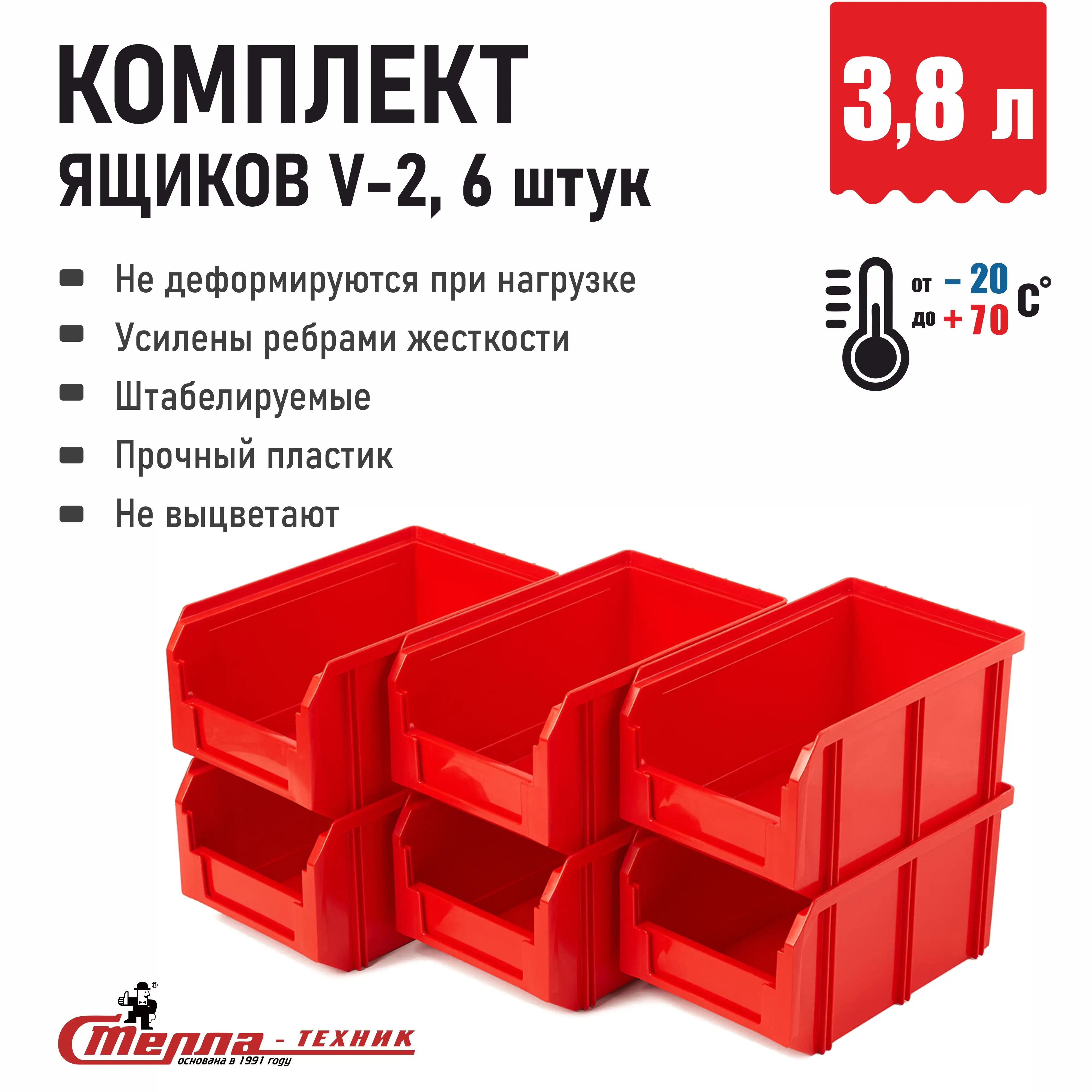 Складской пластиковый ящик, лоток для метизов Стелла-техник (234х149х121 мм), 3,8 л, комплект 6 шт. V-2-К6-красный